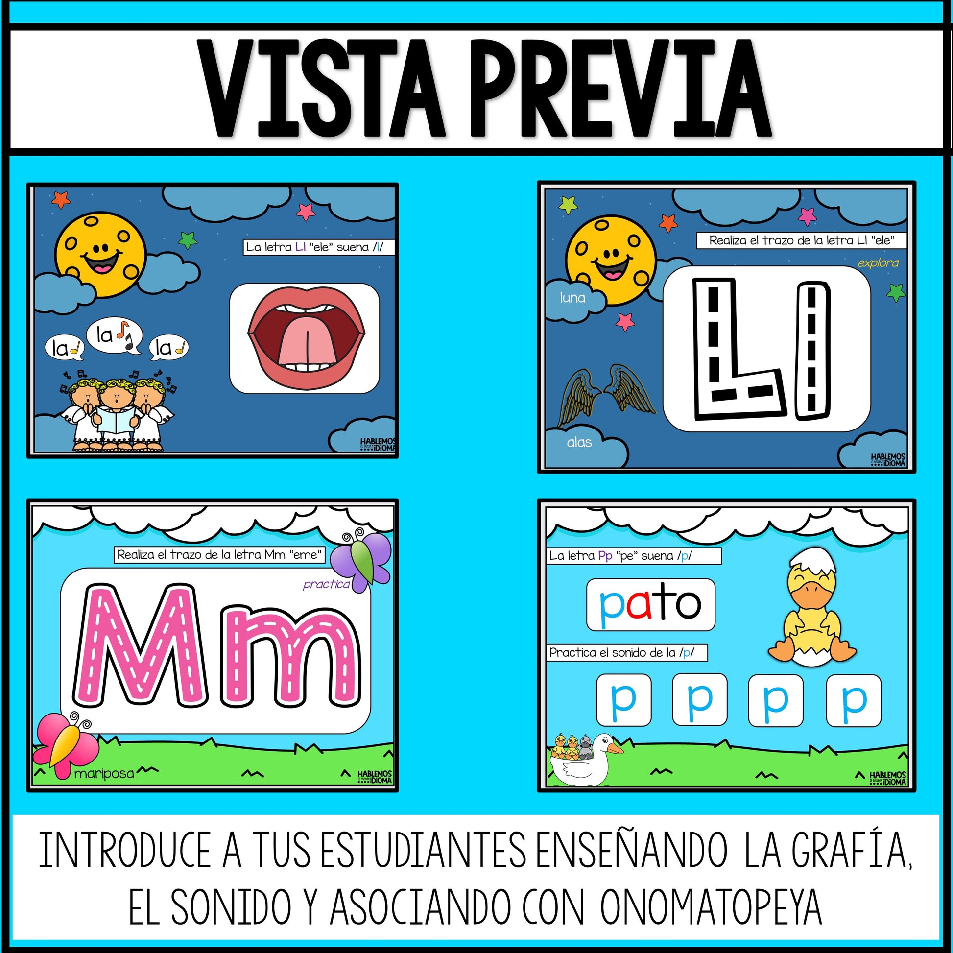 If you need resources to work on reading, writing and comprehension in an interactive way, this resource is for you. The package consists of five PowerPoint presentations, ideal for the daily routine in Spanish and therapy classes.