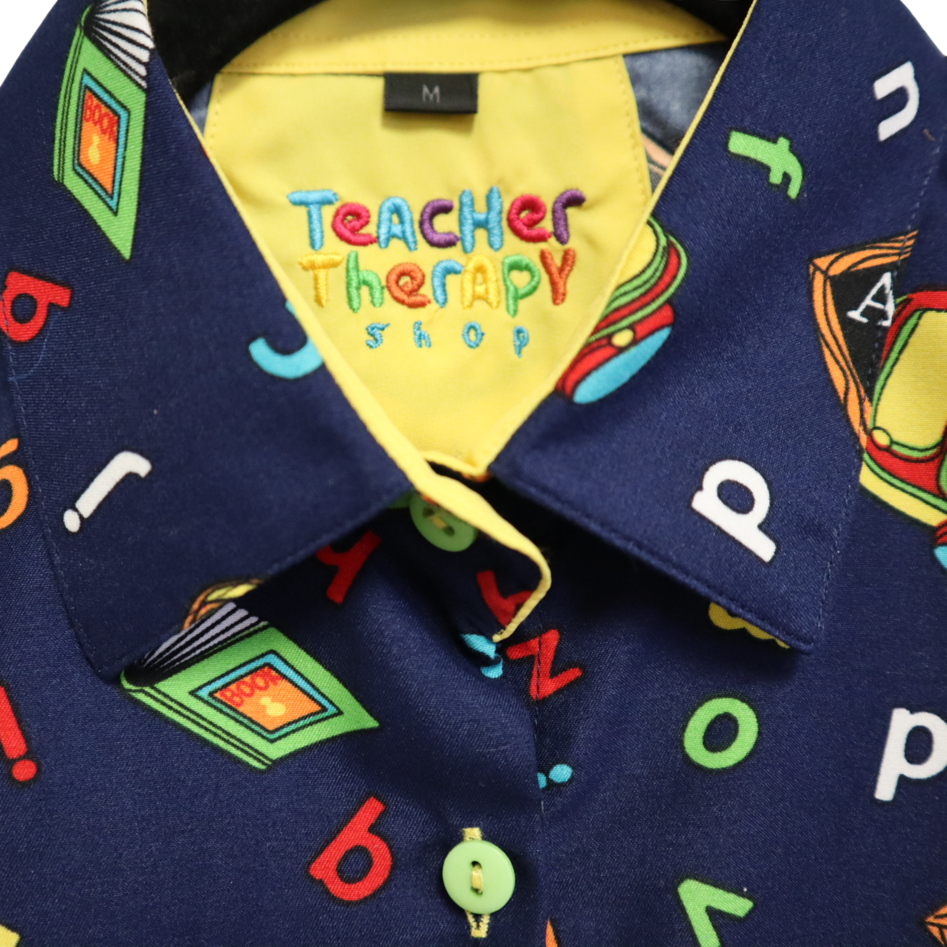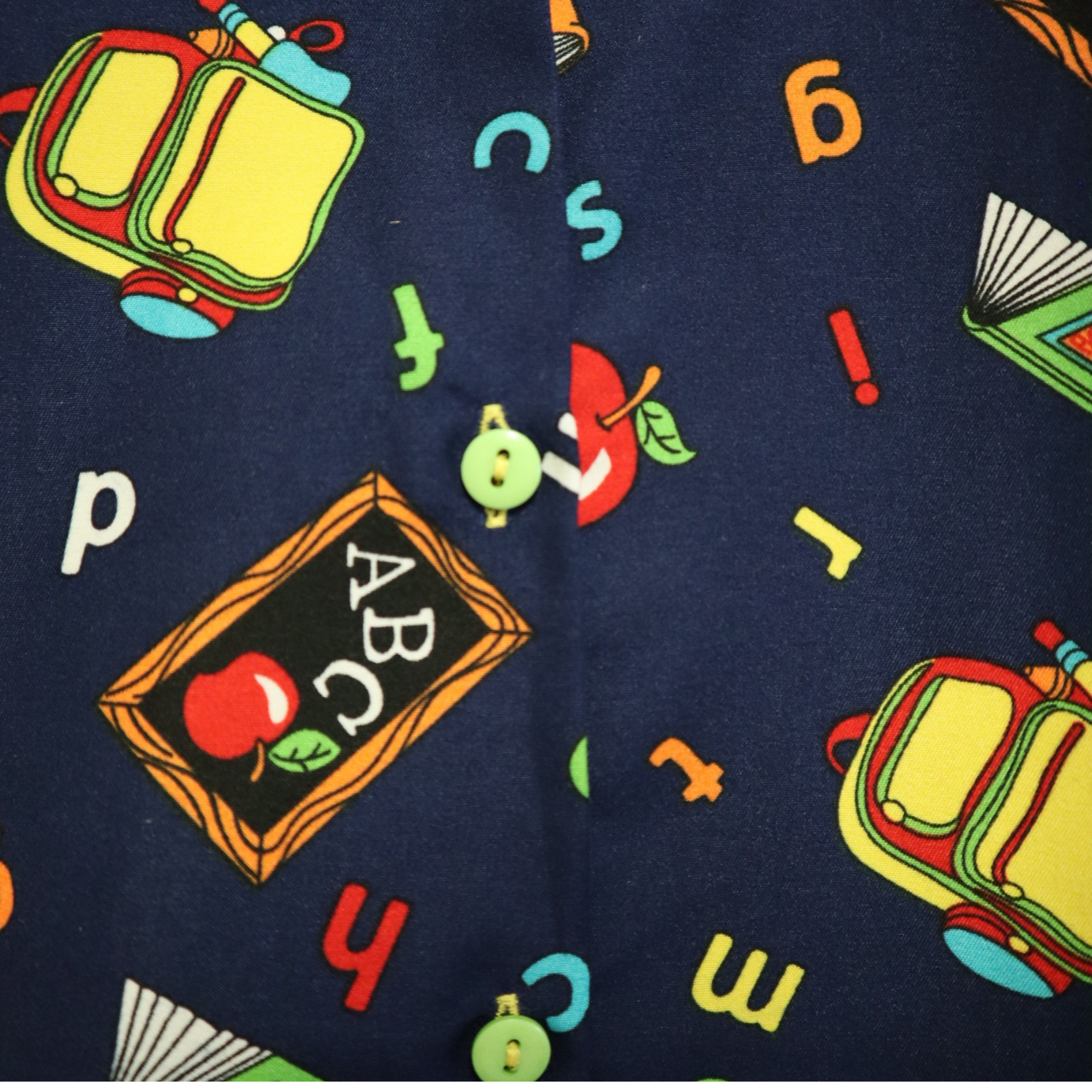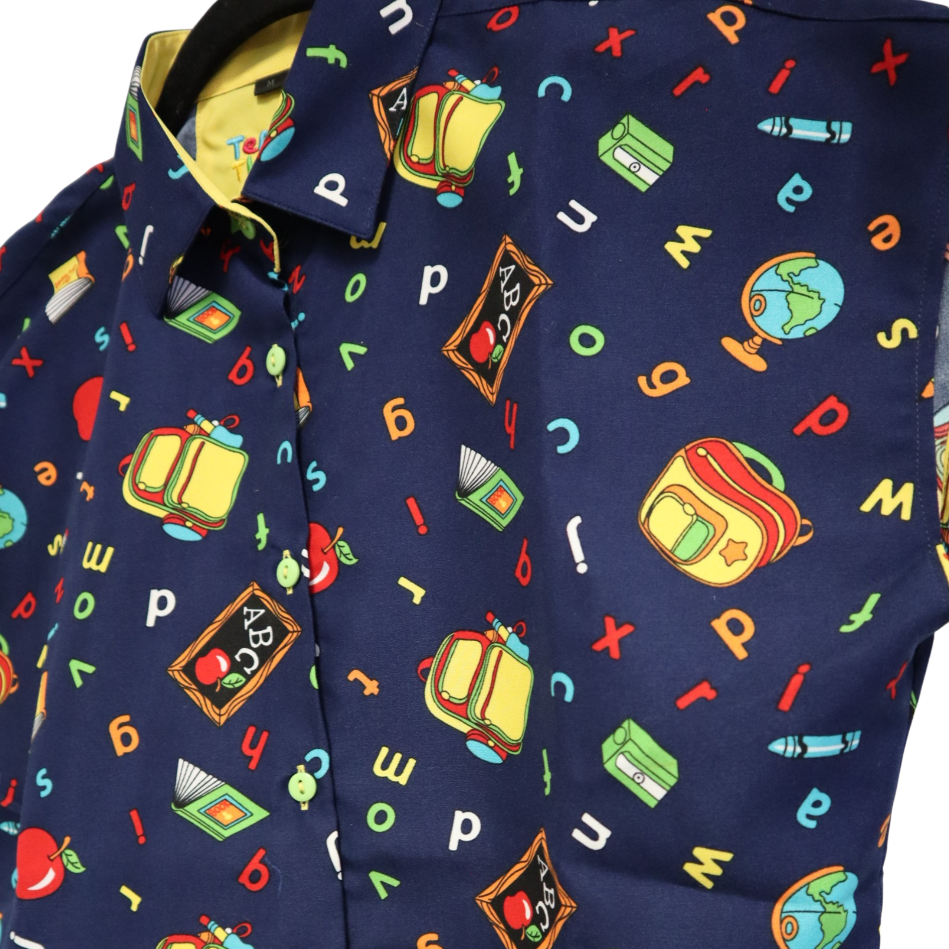 Camisa de vestir "ABC School " fondo azul marino con letras y efectos escolares, contraste amarillo brillante y bordado interior.