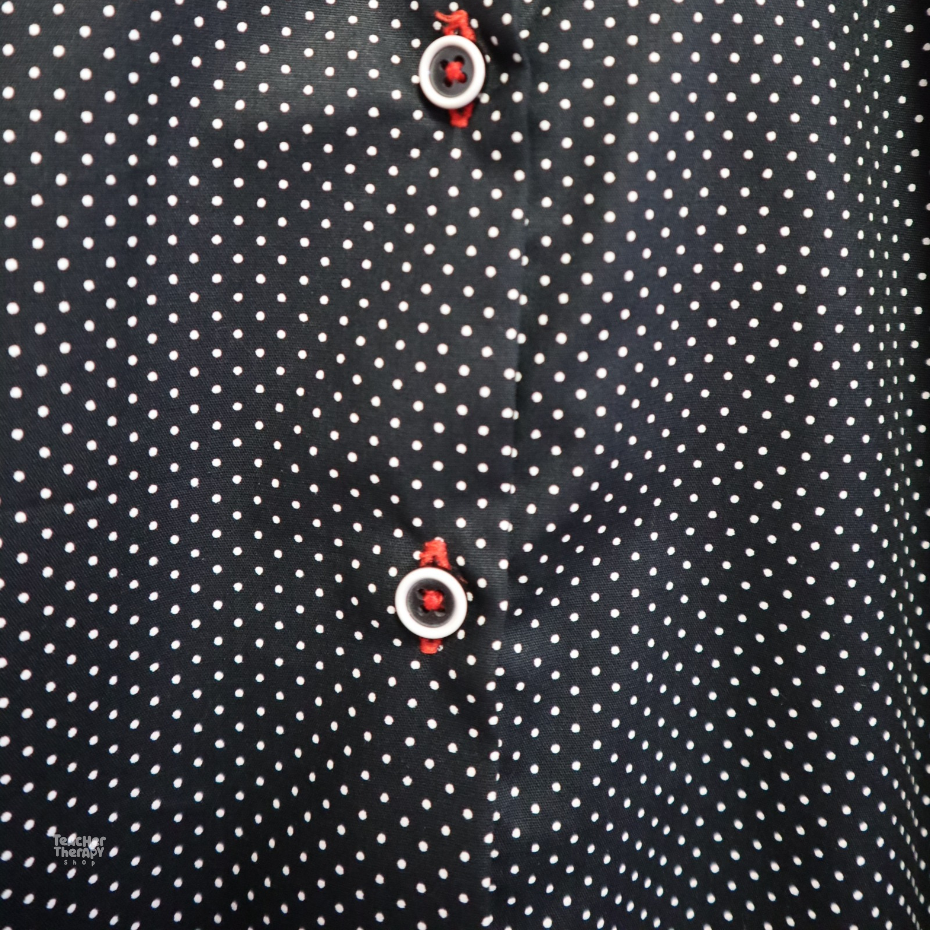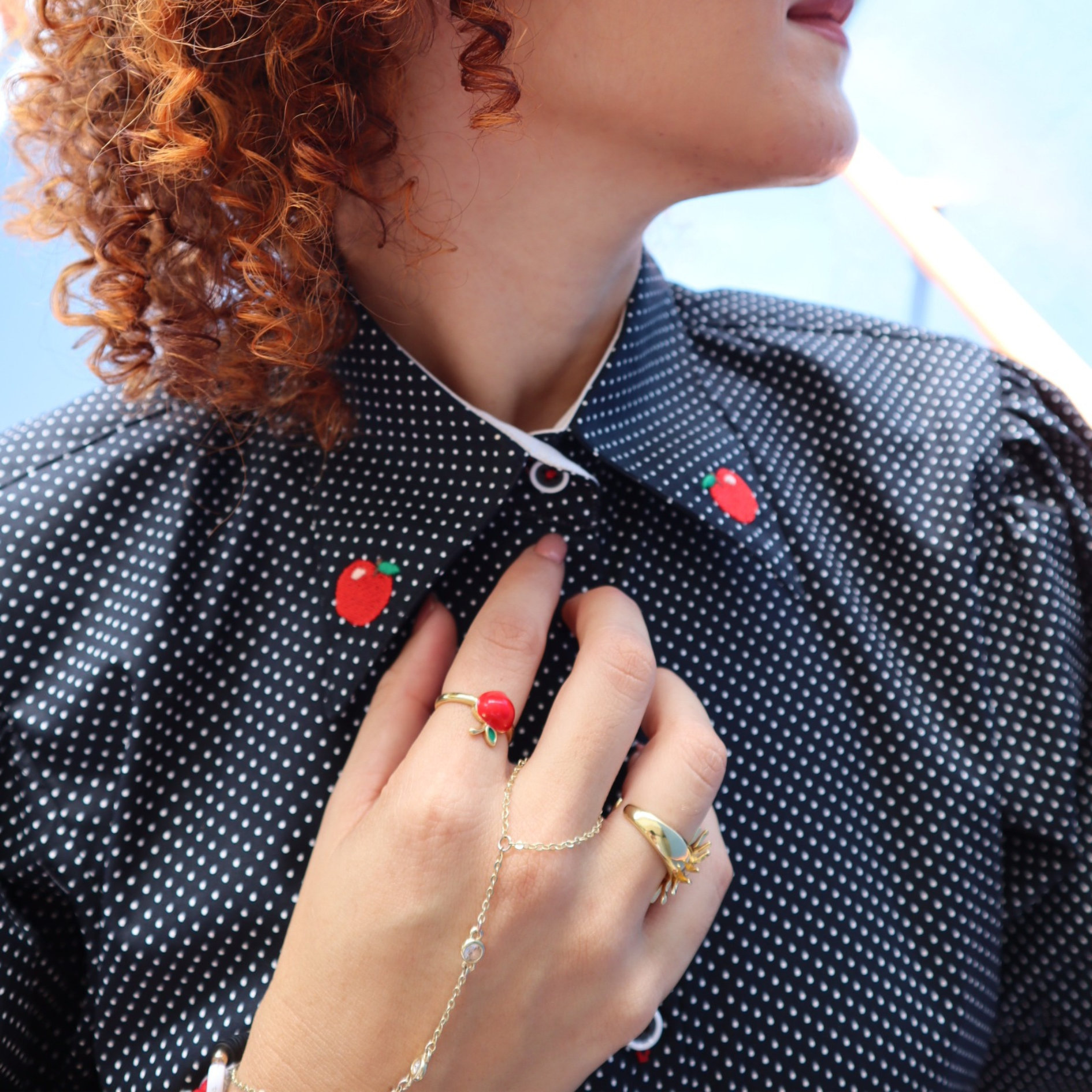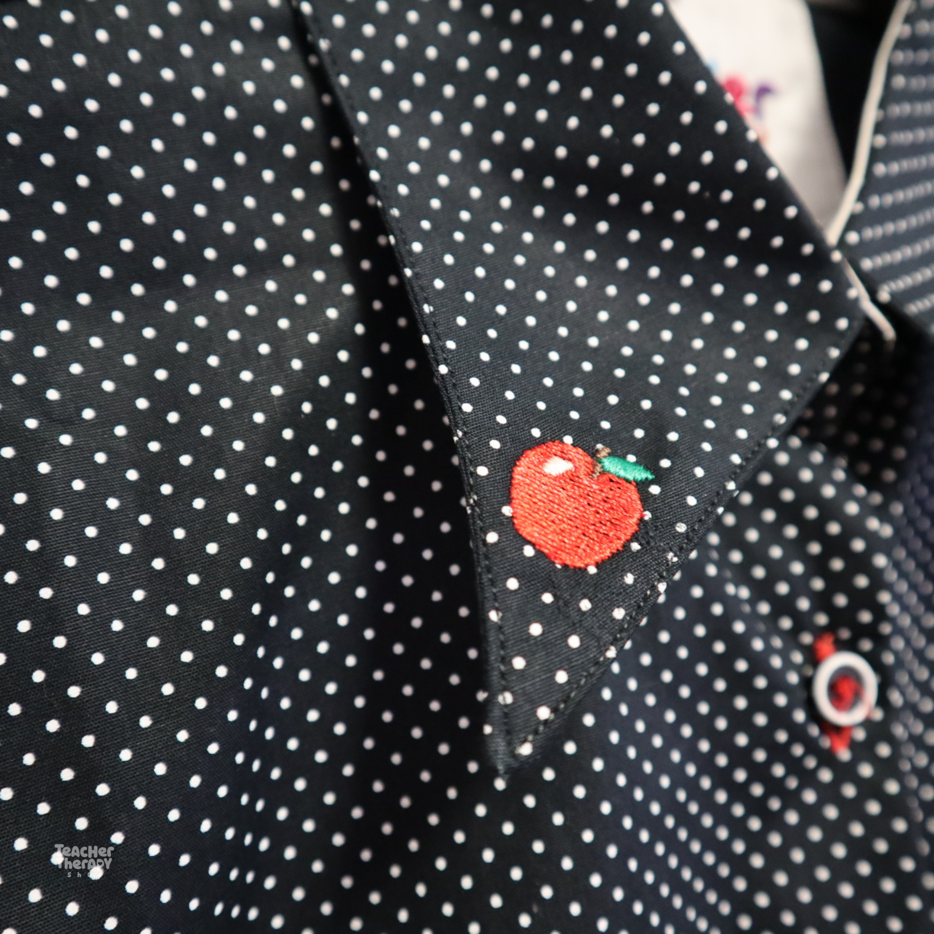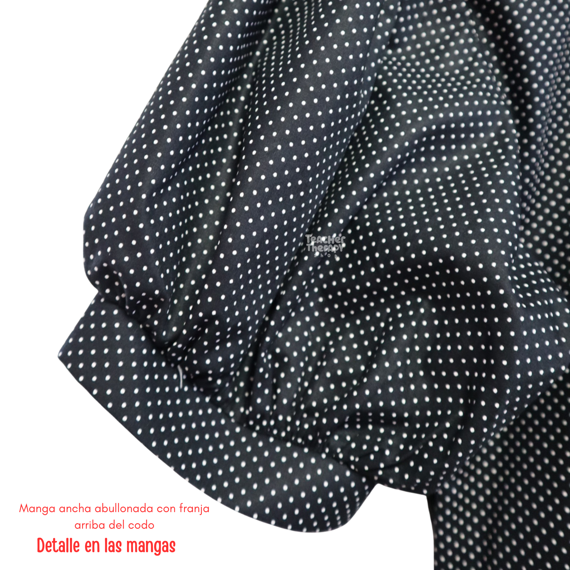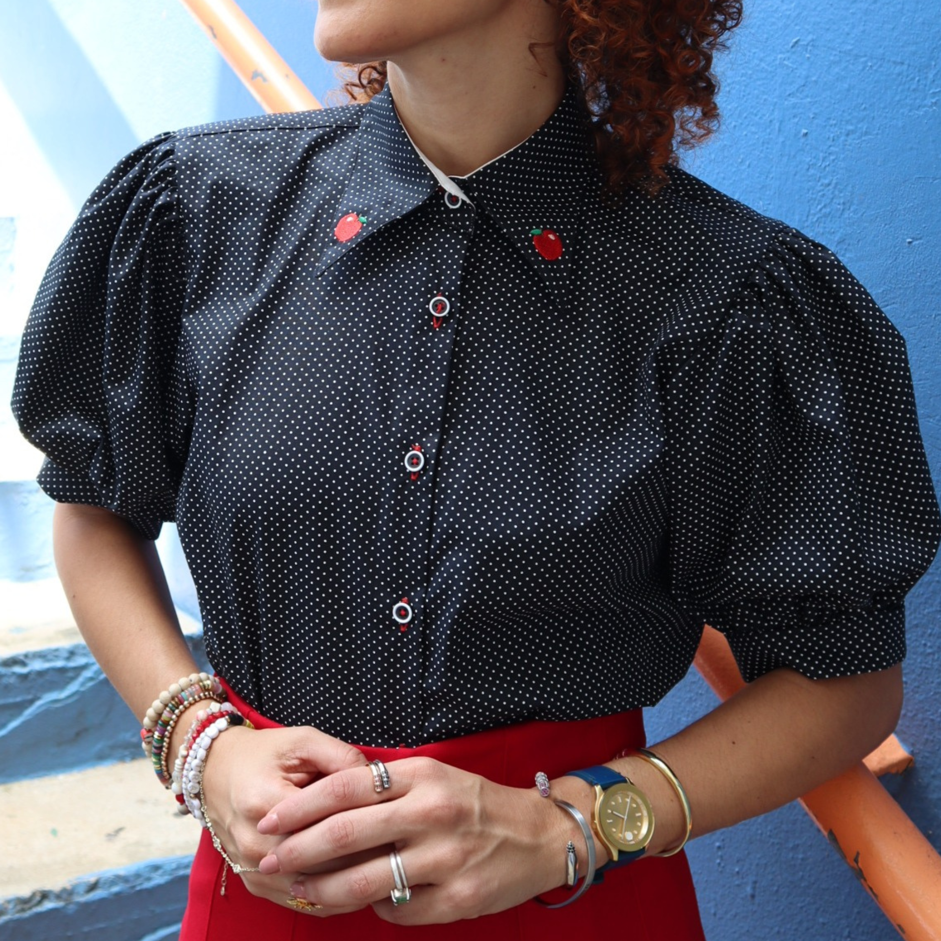 ✨ Camisa de vestir "Apple dots" negra con puntos blancos,contraste blanco y bordado en el cuello en forma de manzana. Este diseño tiene el cuello inspirado en un estilo "vintage" con mangas abullonadas hasta el codo.