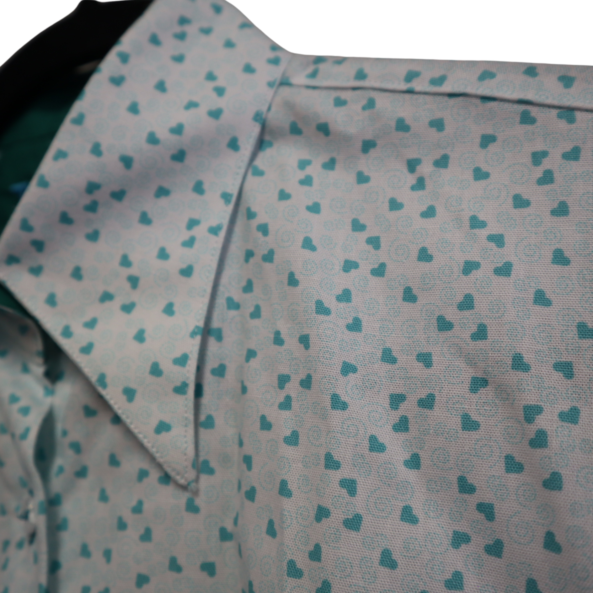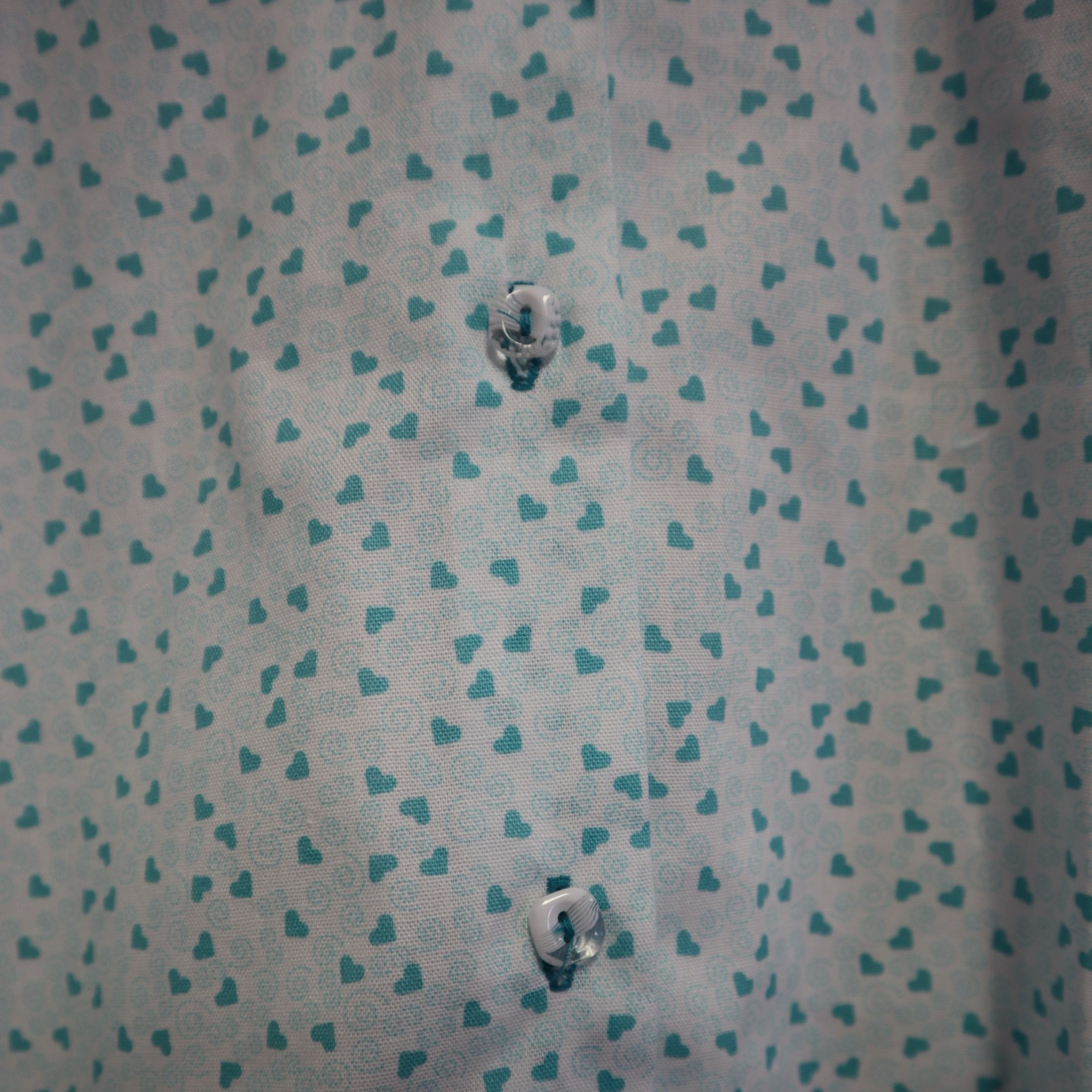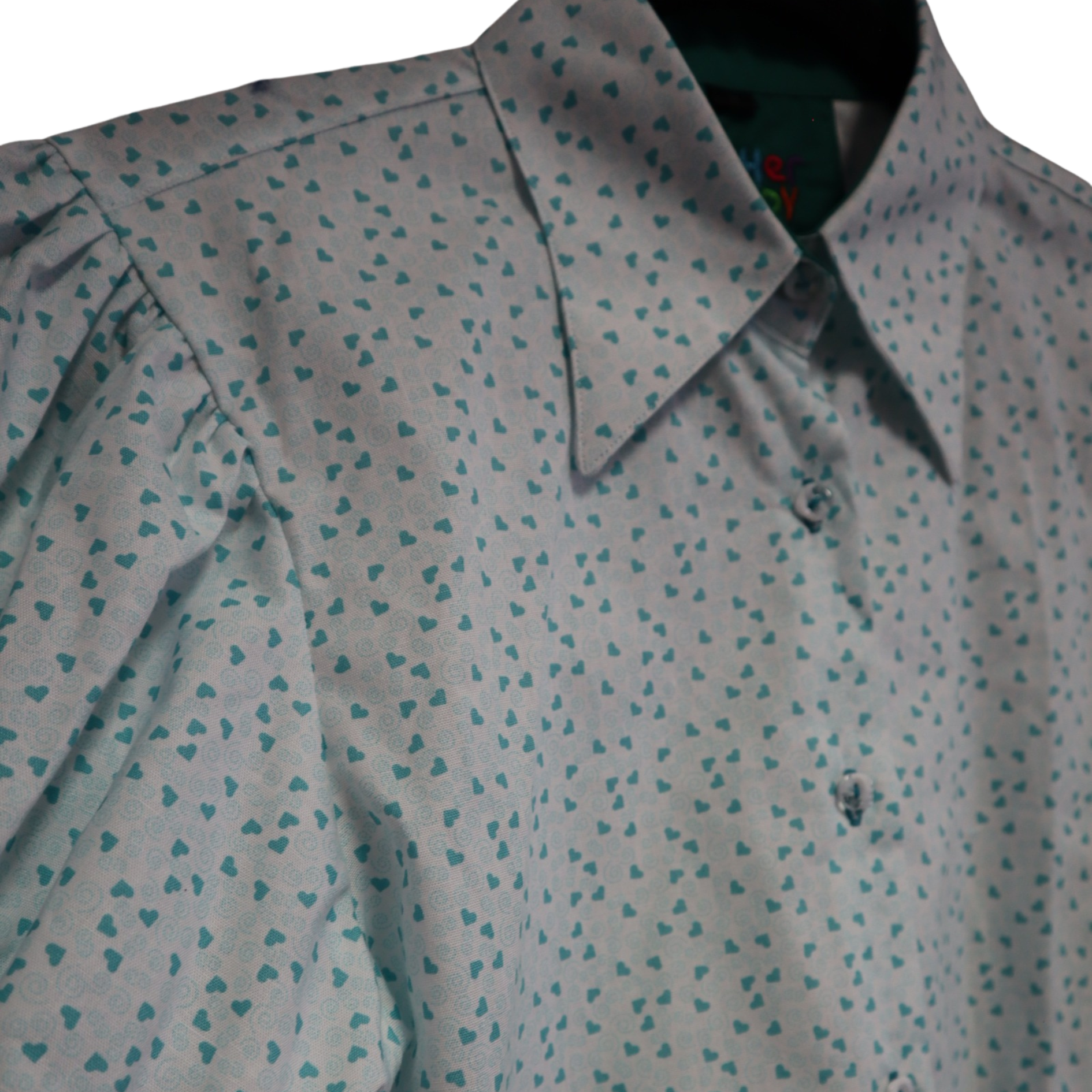 ✨ Camisa de vestir "Aqua hearts" fondo blanco con diseños de corazones en color aqua. Este diseño tiene el cuello inspirado en un estilo "vintage" con mangas abullonadas hasta el codo.