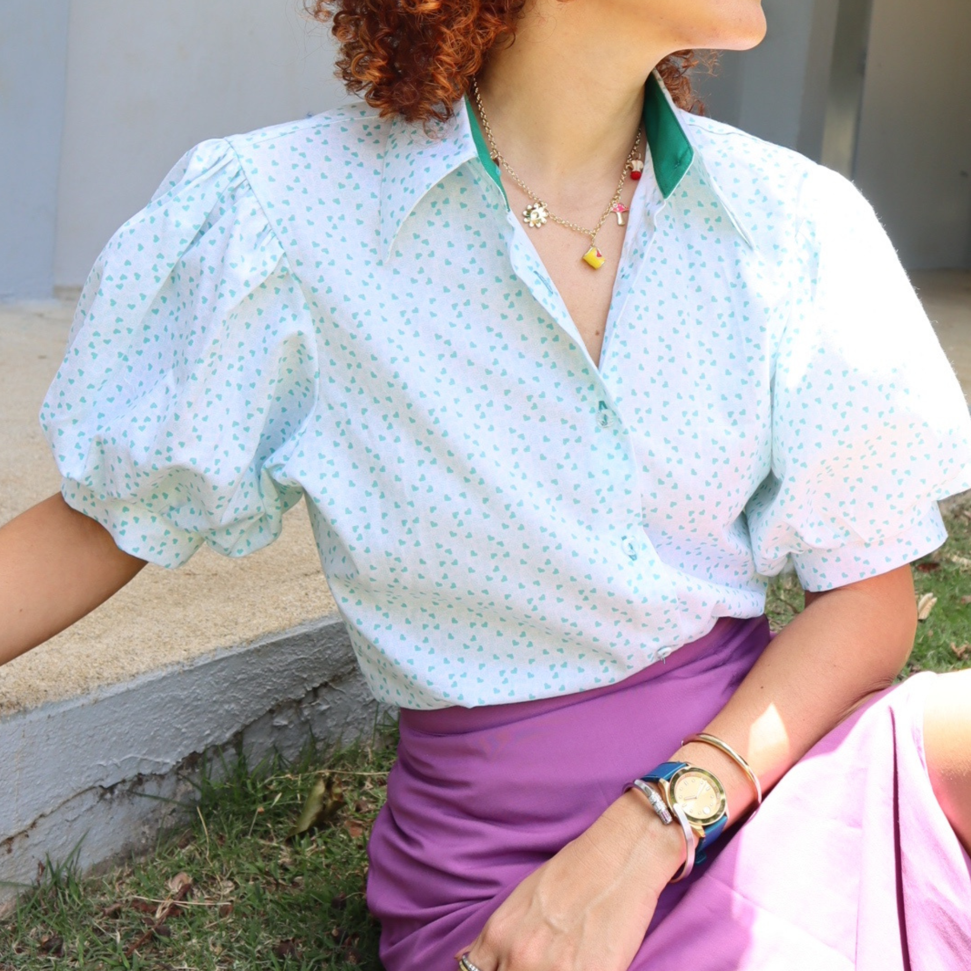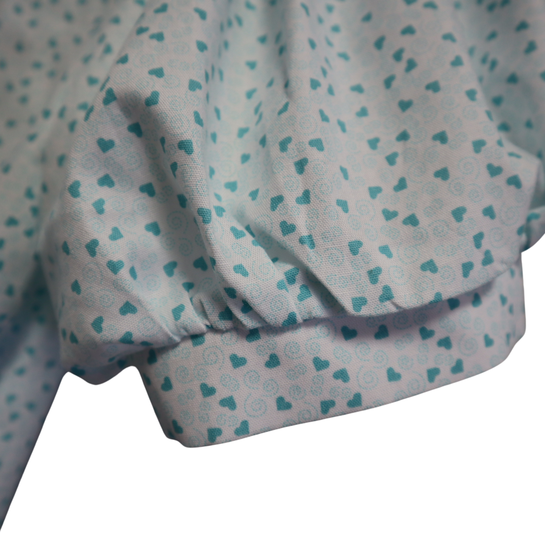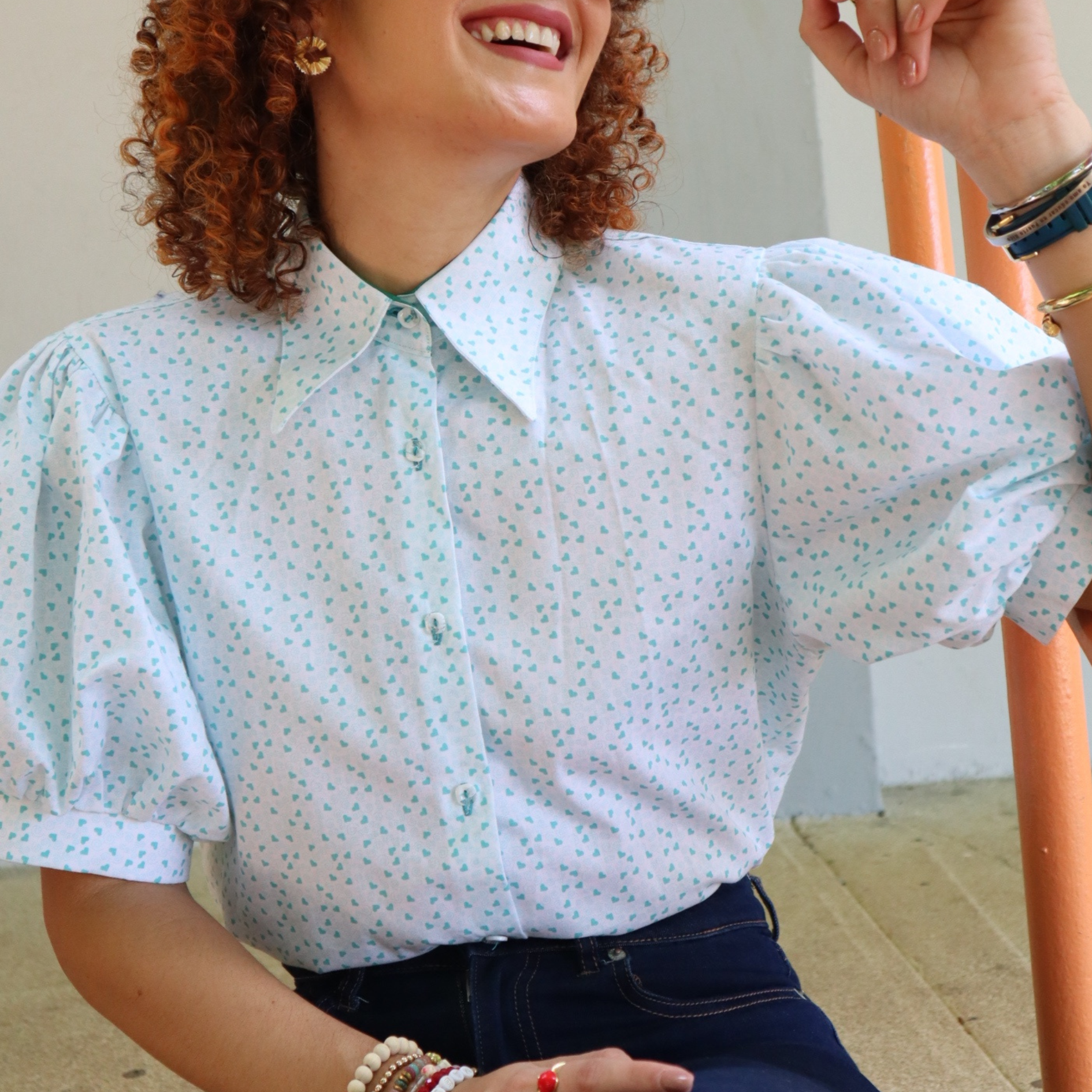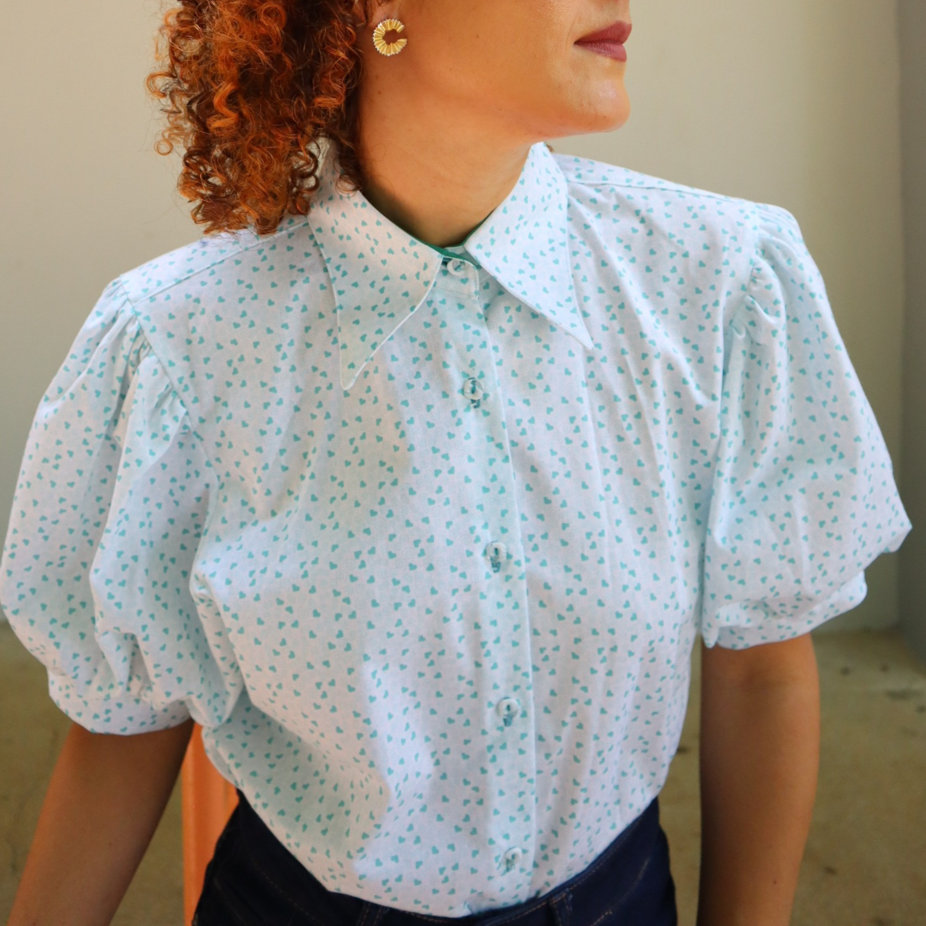 ✨ Camisa de vestir "Aqua hearts" fondo blanco con diseños de corazones en color aqua. Este diseño tiene el cuello inspirado en un estilo "vintage" con mangas abullonadas hasta el codo.