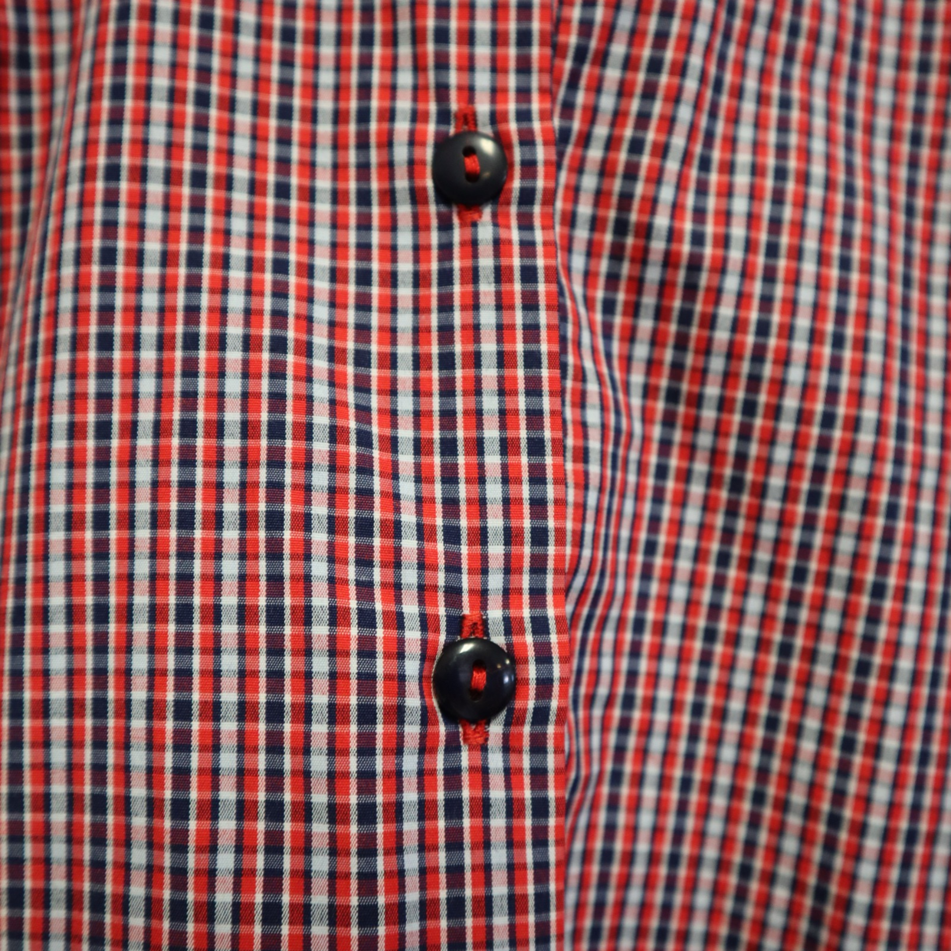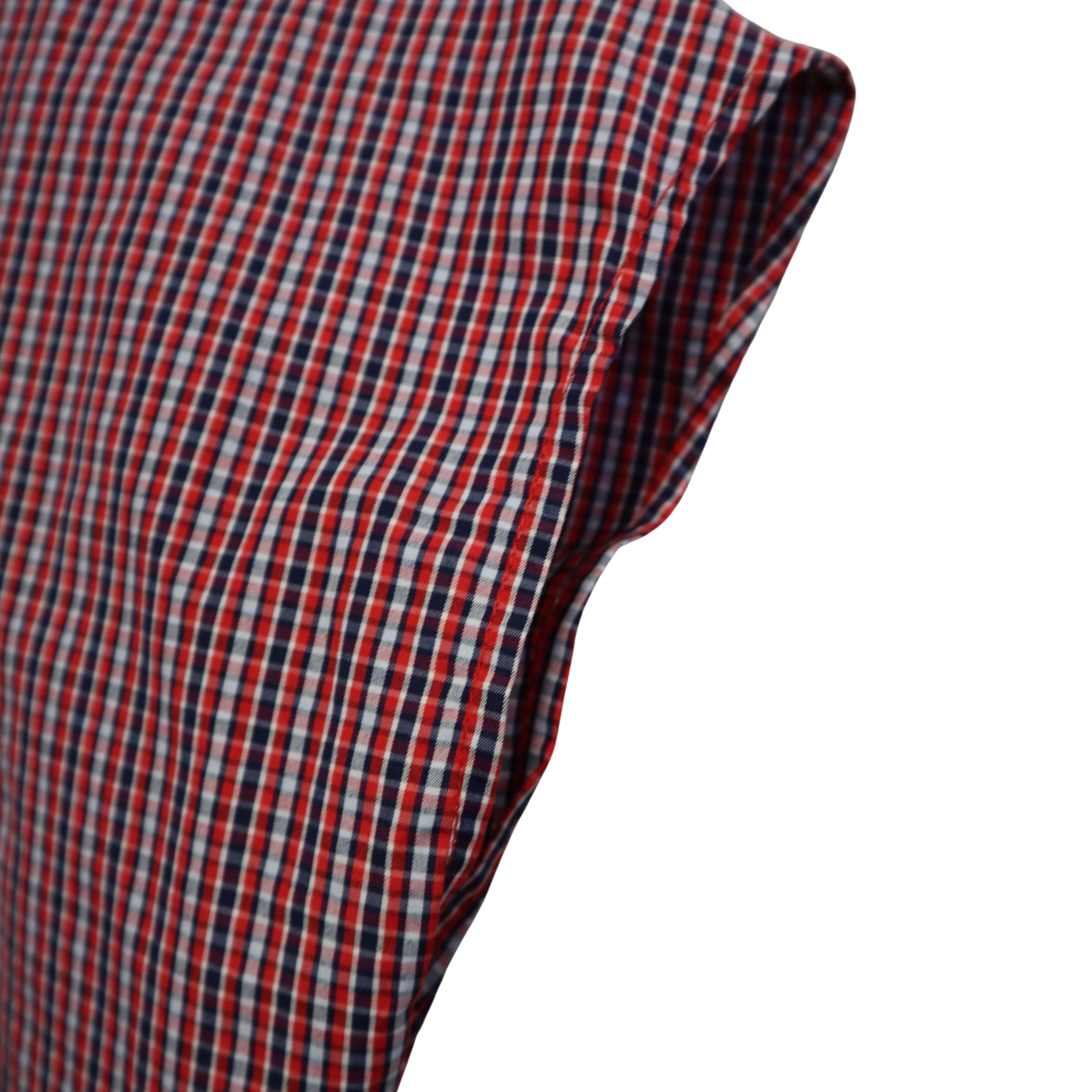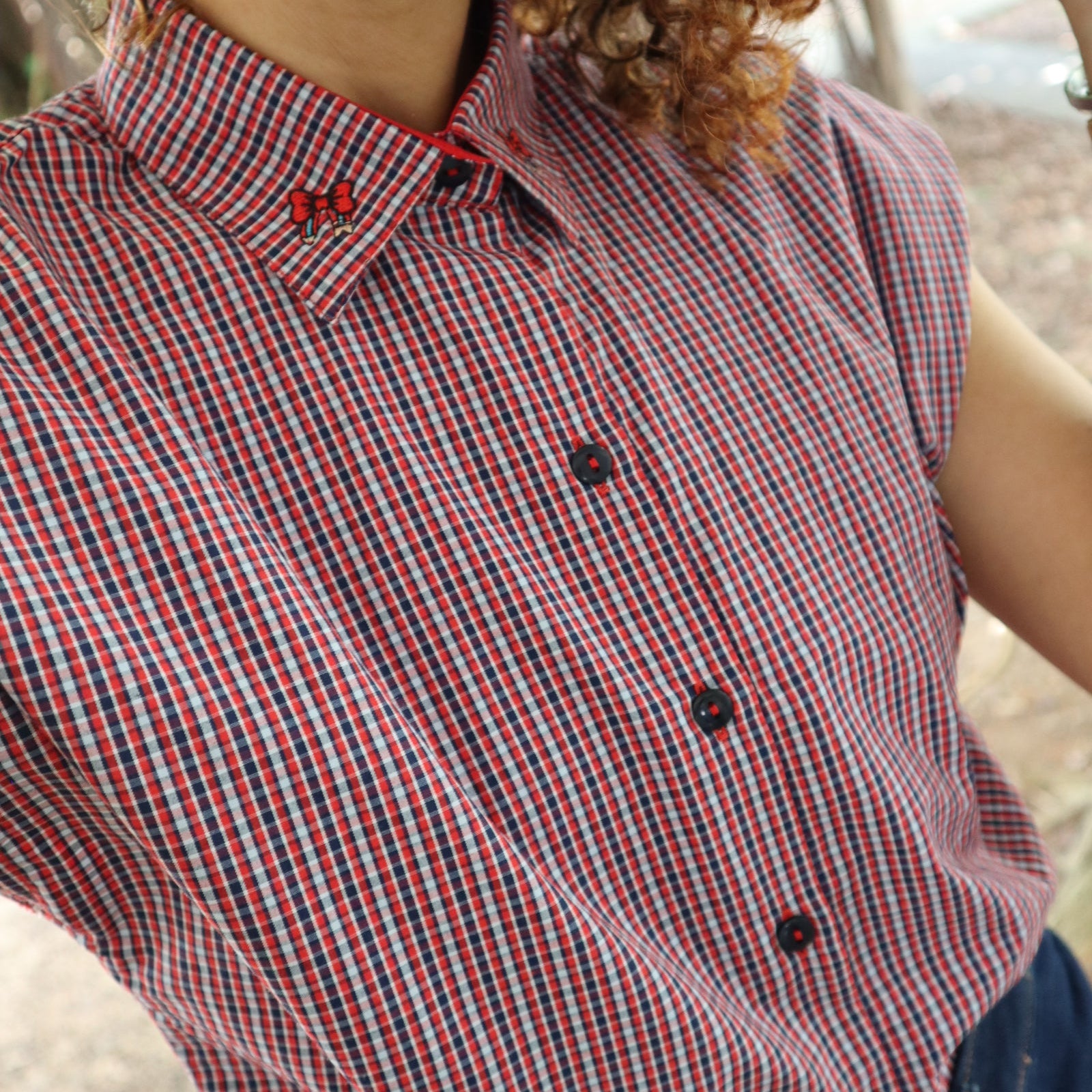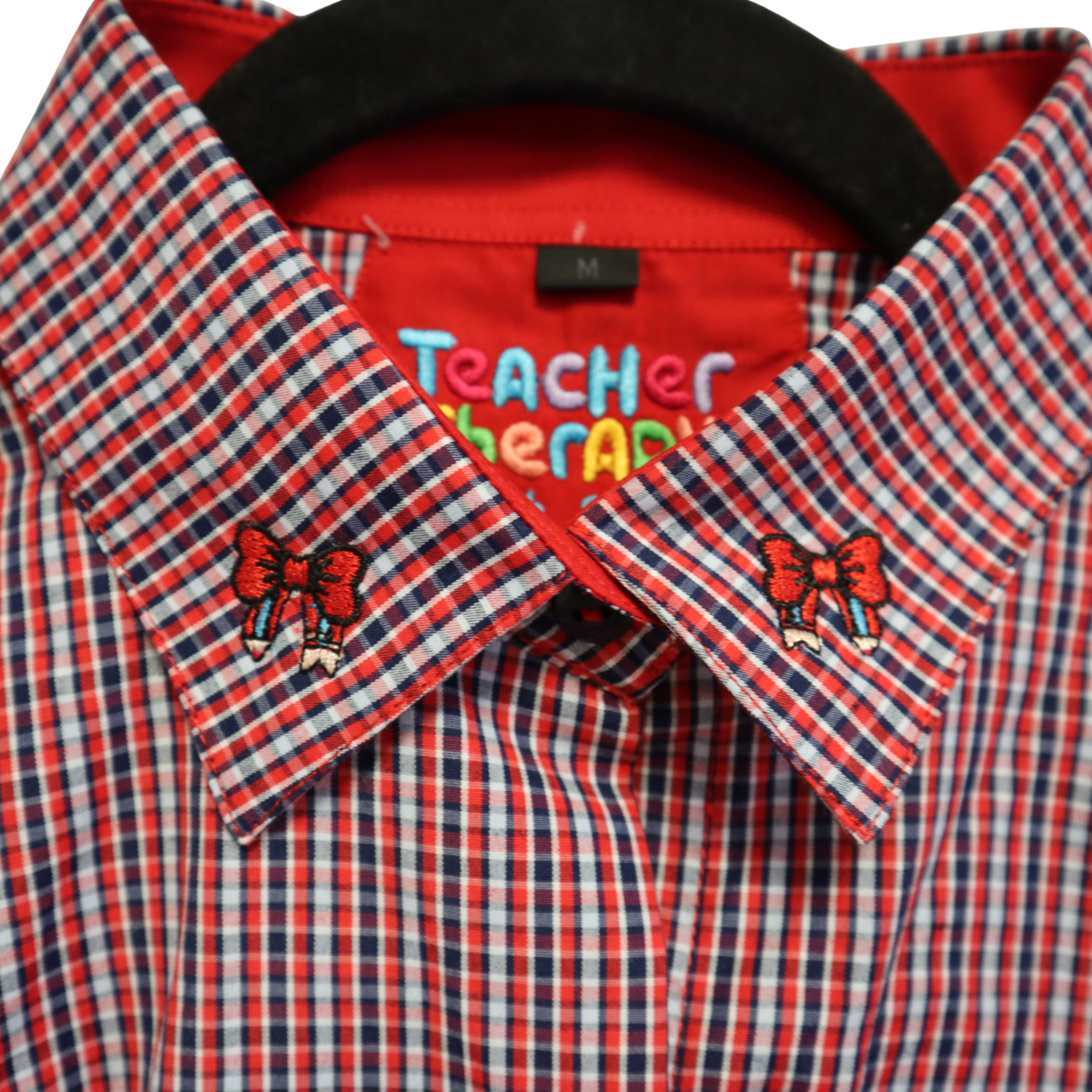 Camisa de vestir "Bow Pencil Chic" con estampado de cuadros azul marino, rojo y blanco, contraste interior rojo y bordado en el cuello con un lápiz en forma de lazo.