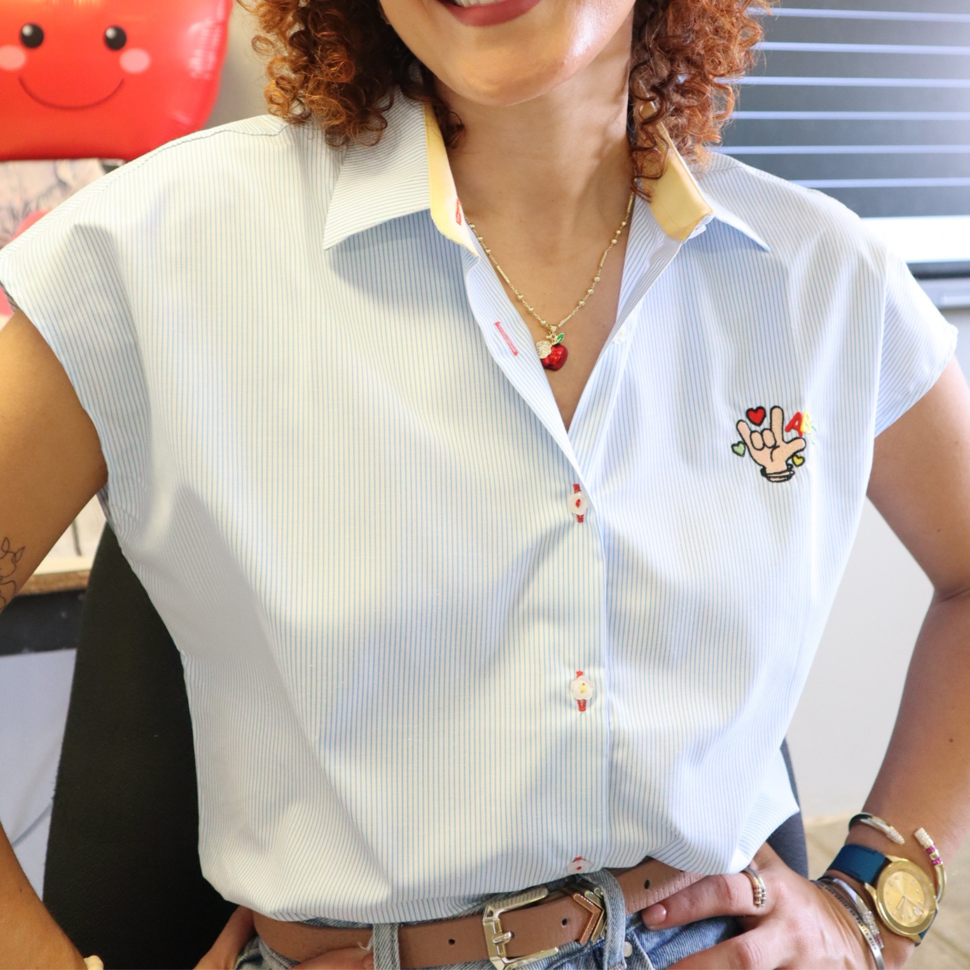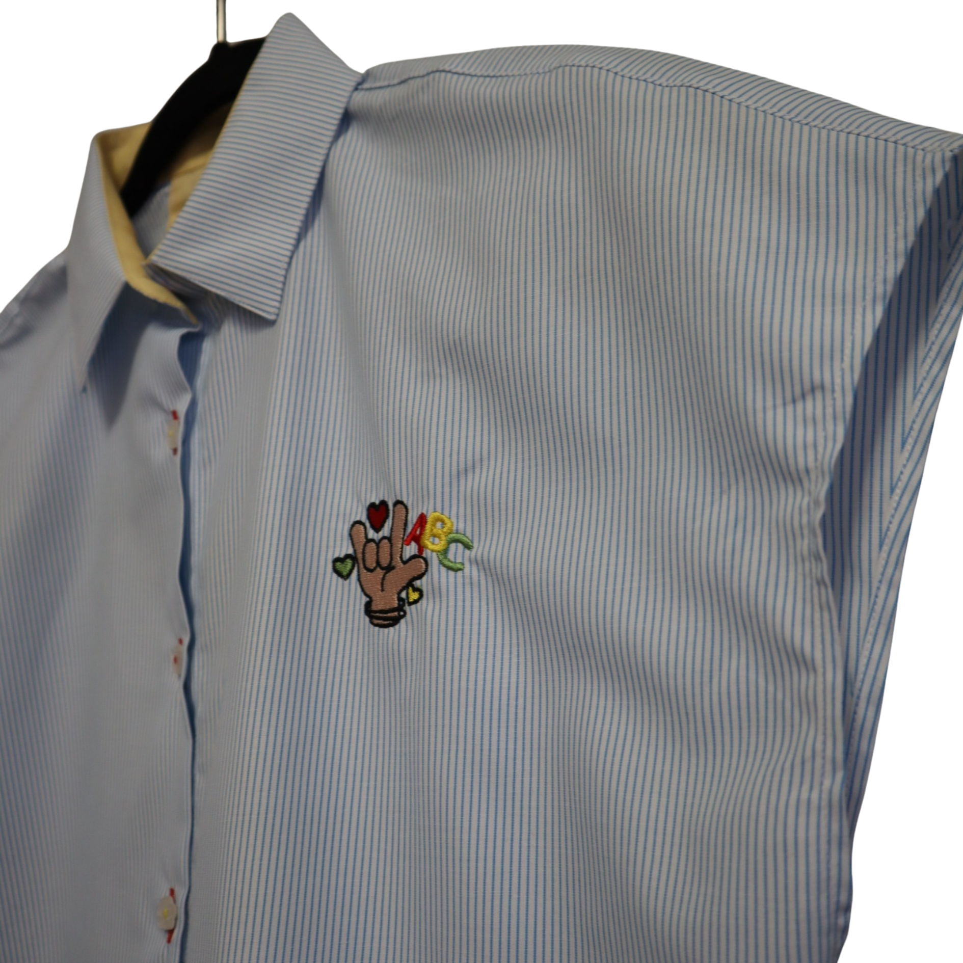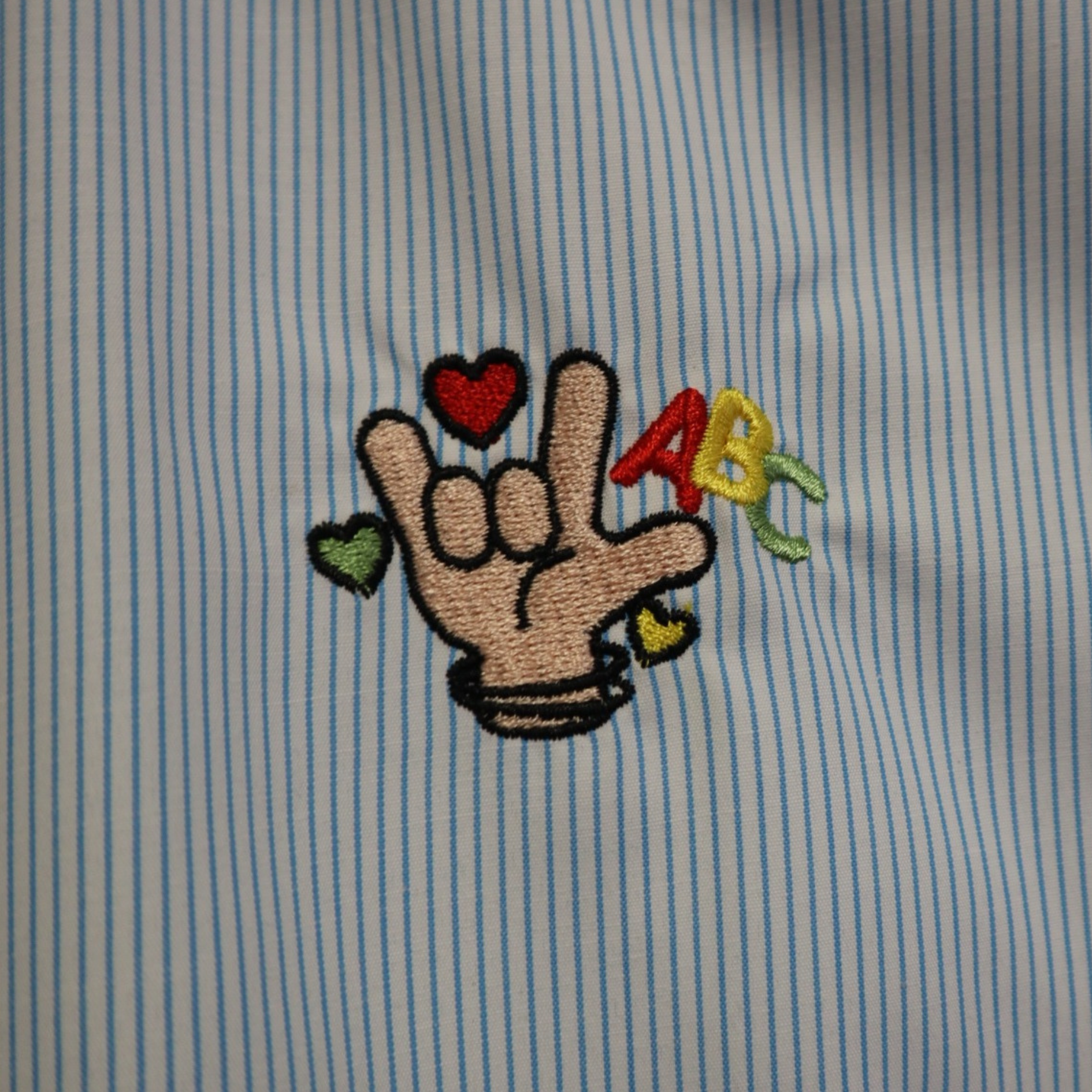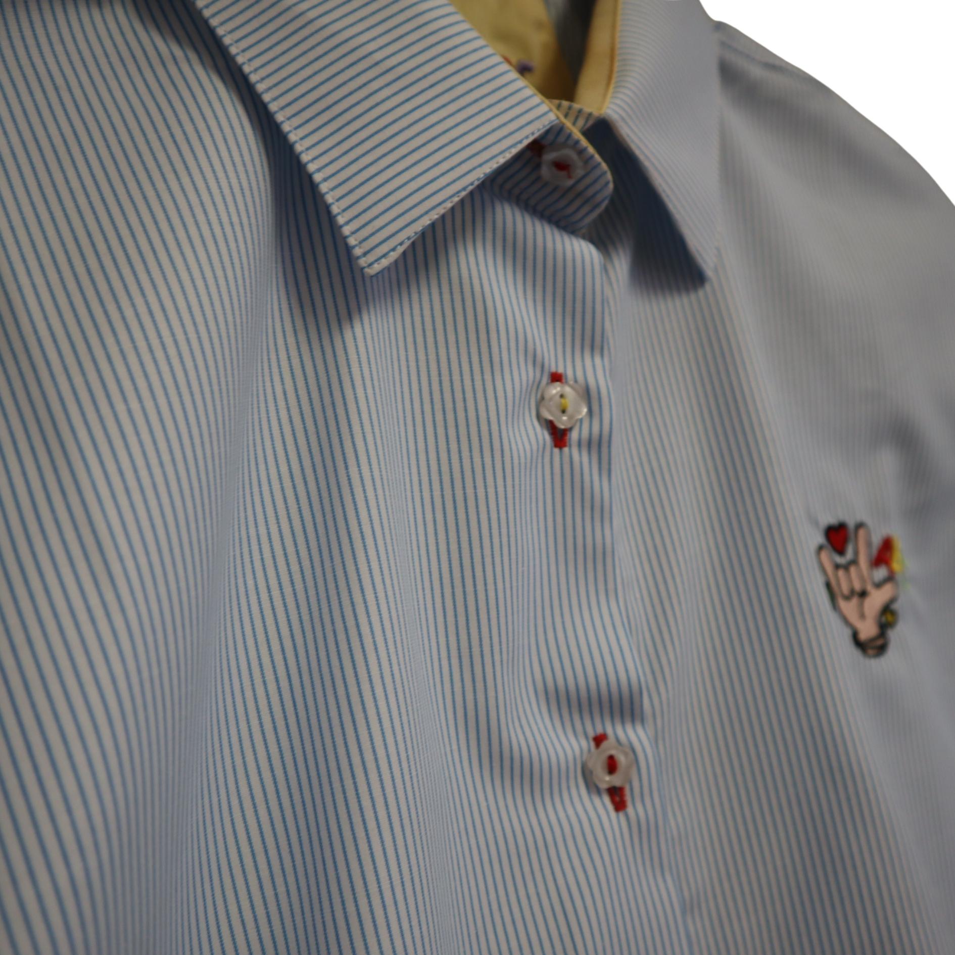 Camisa de vestir con estampado "ASL notebook" con líneas azules, contraste interior amarillo, bordado interior y delantero con el símbolo "Love ABC".