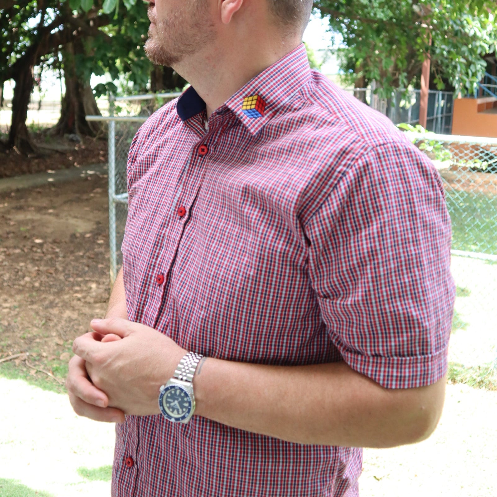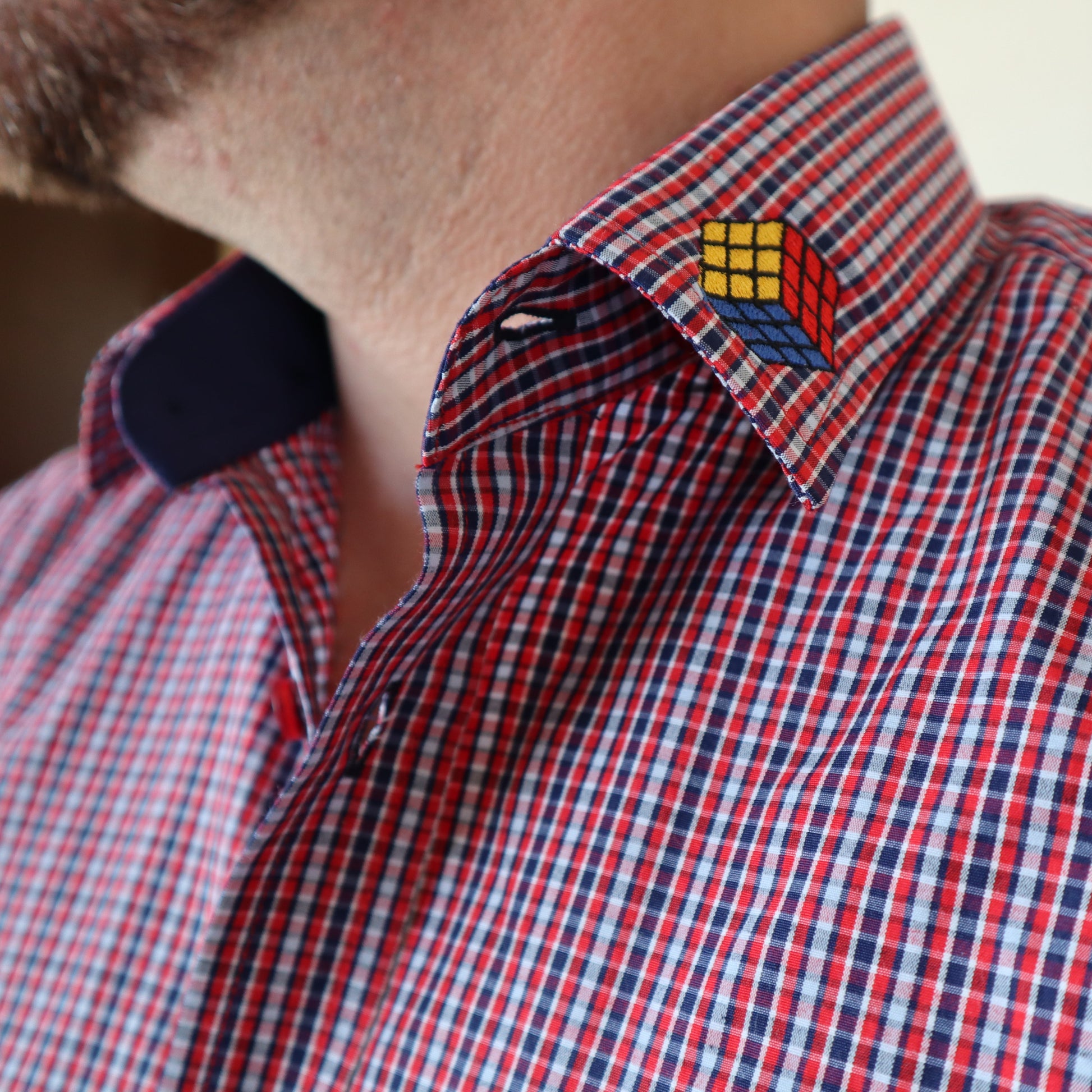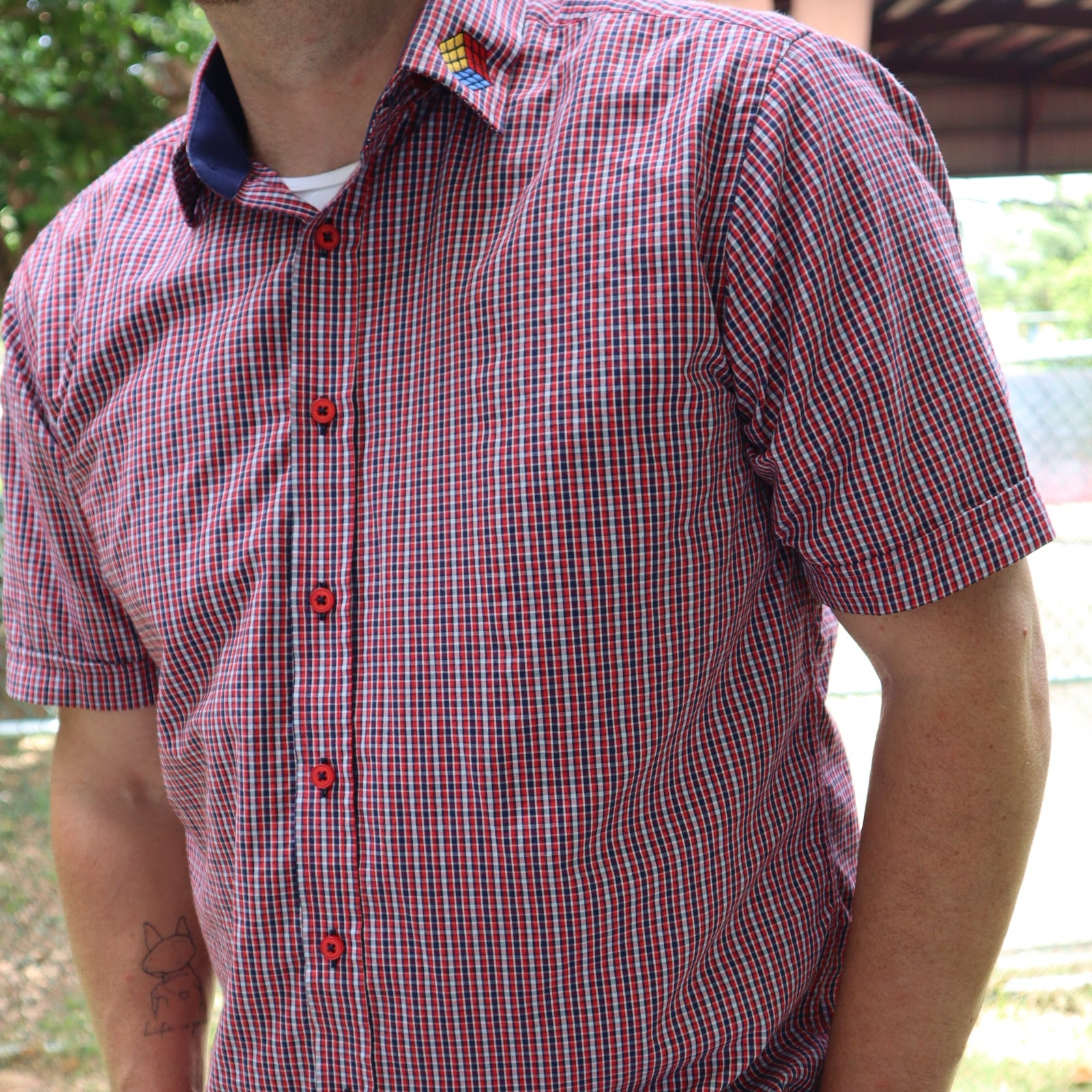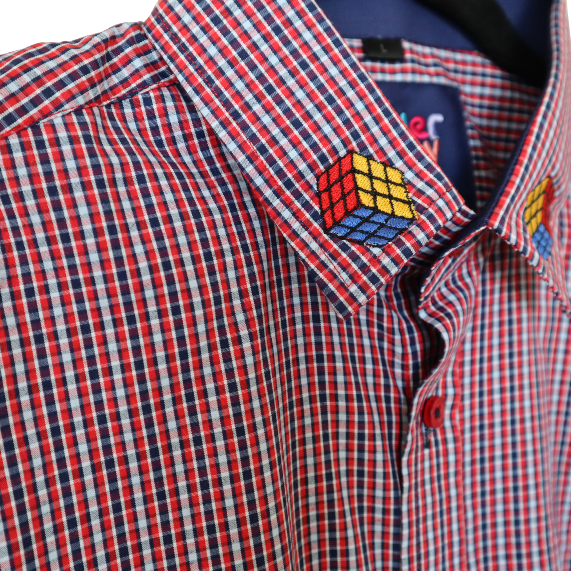 Camisa de hombre cuadros azul marino, rojo y blancos. Botones rojos, contraste azul y bordado con cubo rubik en el cuello.