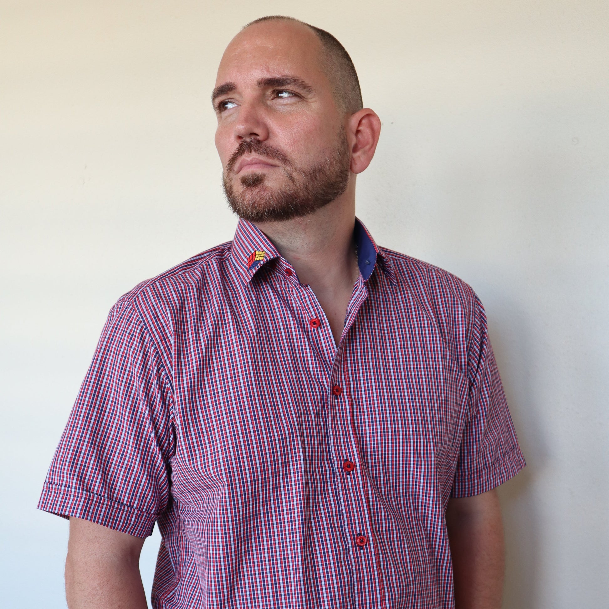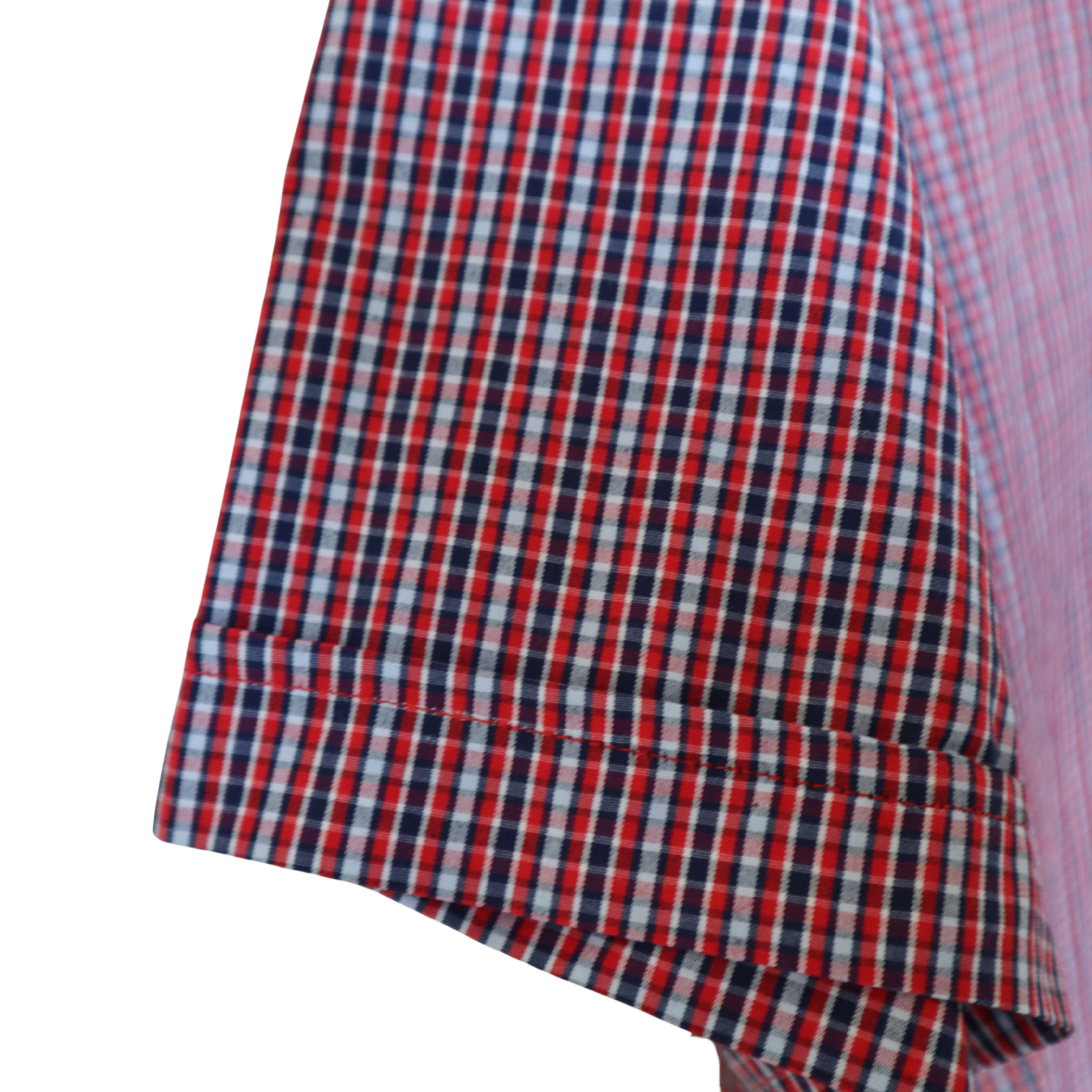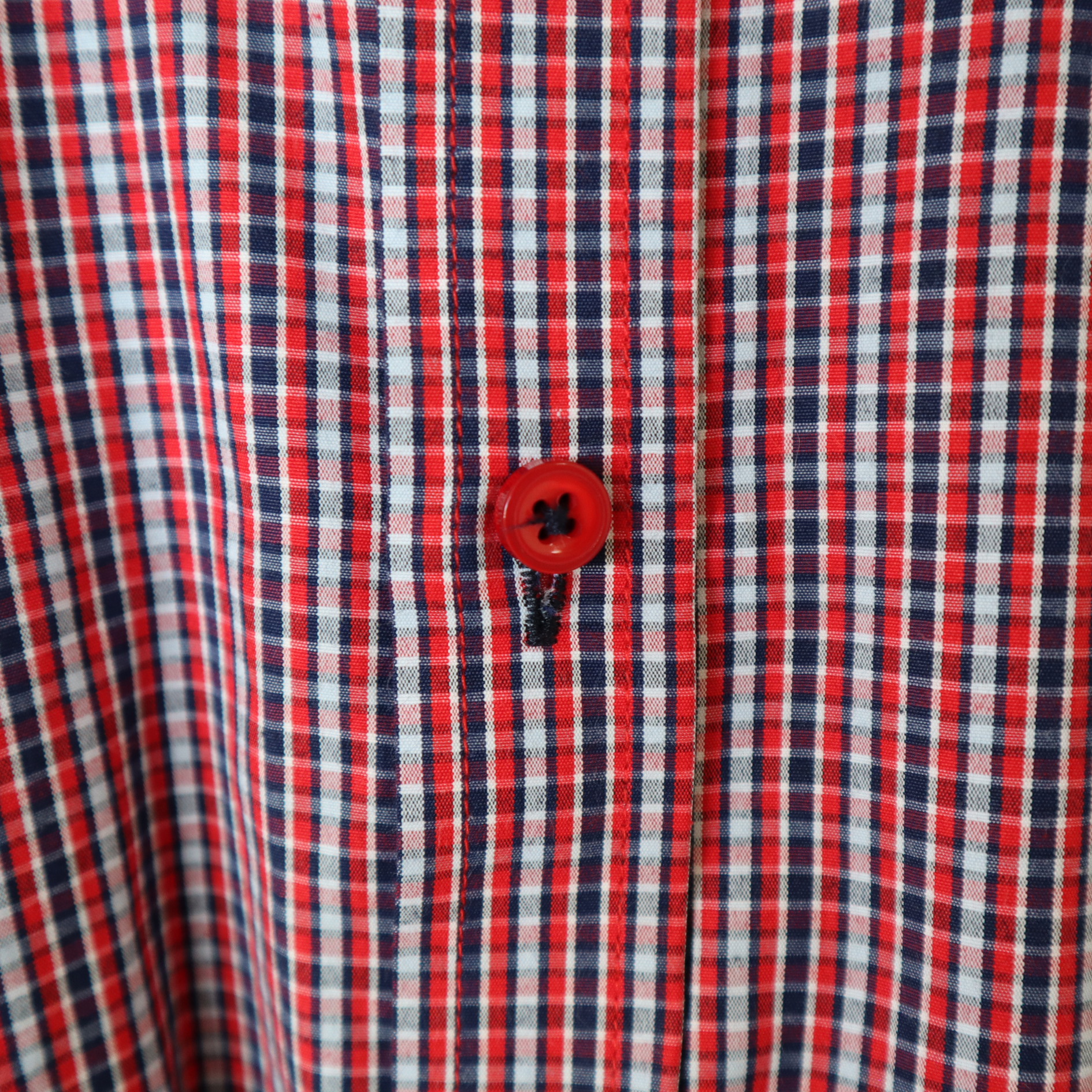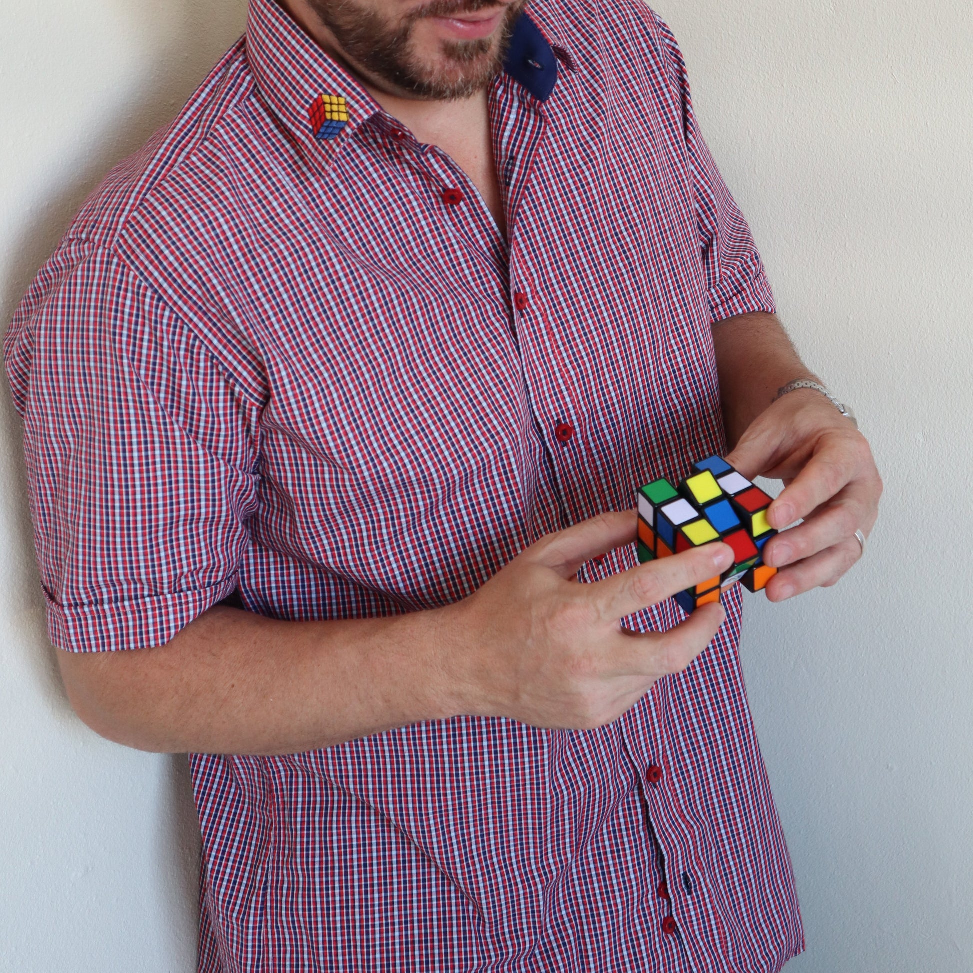 Camisa de hombre cuadros azul marino, rojo y blancos. Botones rojos, contraste azul y bordado con cubo rubik en el cuello.