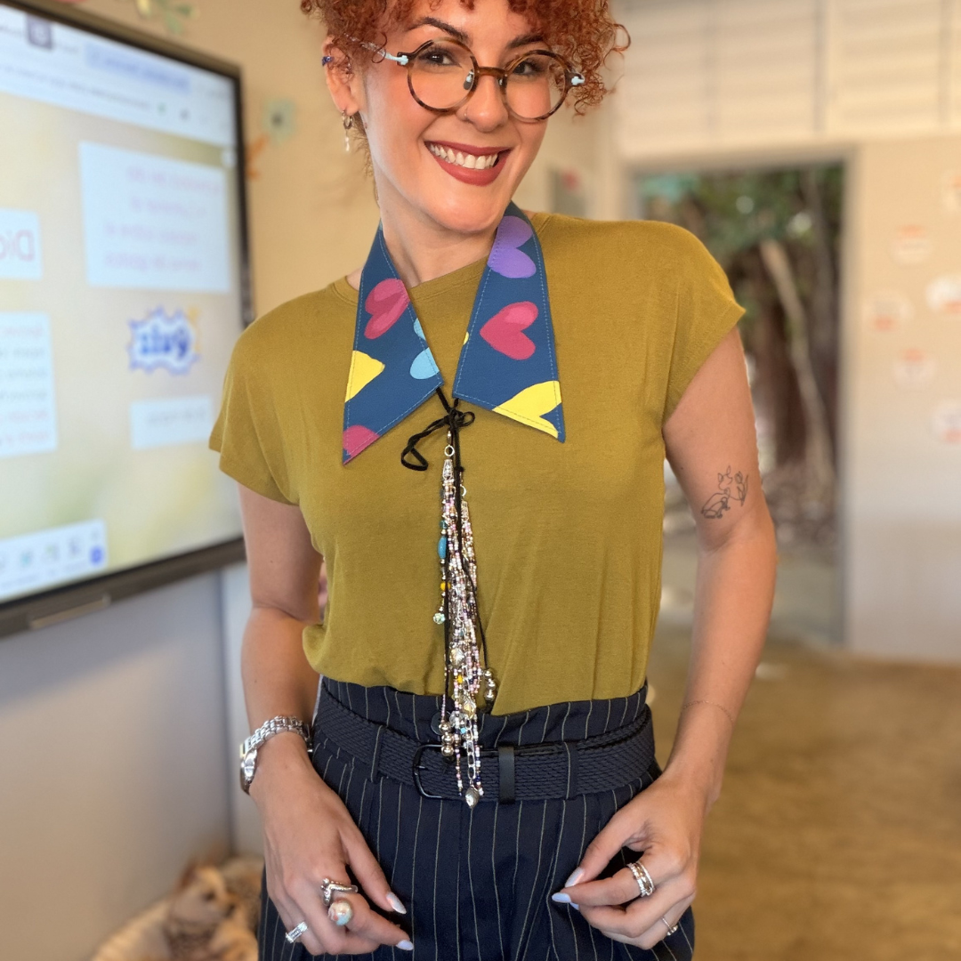 El collar está elaborado 100% a mano en cuero, cuidadosamente forrado con tela estampada de corazones multicolores, lo que lo convierte en un accesorio alegre y lleno de vida. Su diseño se complementa con cintas ajustables y delicados colgantes de cristales, cuentas y cadenas, que aportan movimiento, brillo y un acabado artesanal único.