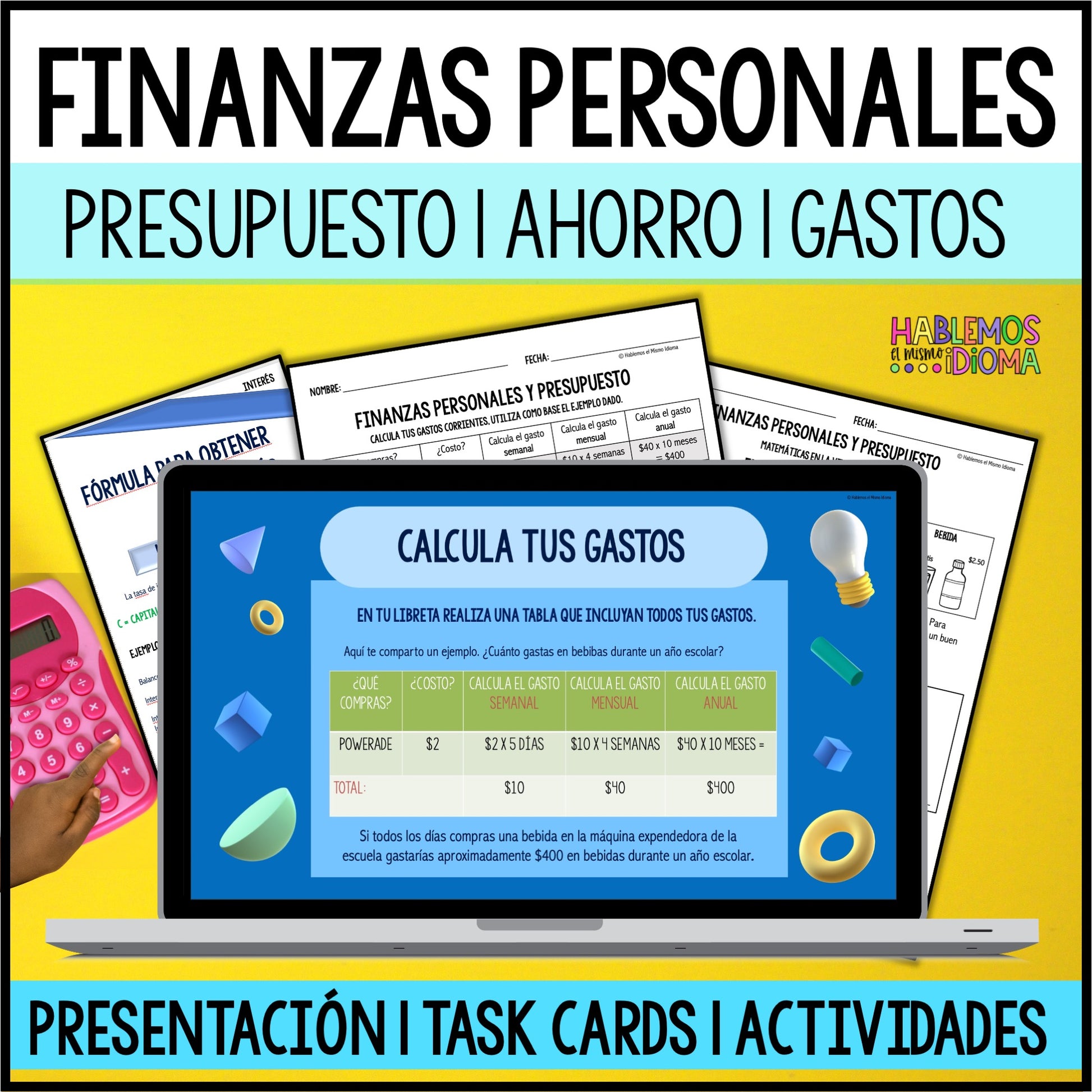 La presentación tiene 46 diapositivas con información, fórmulas, actividades y más en adición se incluyen hojas de trabajo, task cards, mini posters, entre otros.