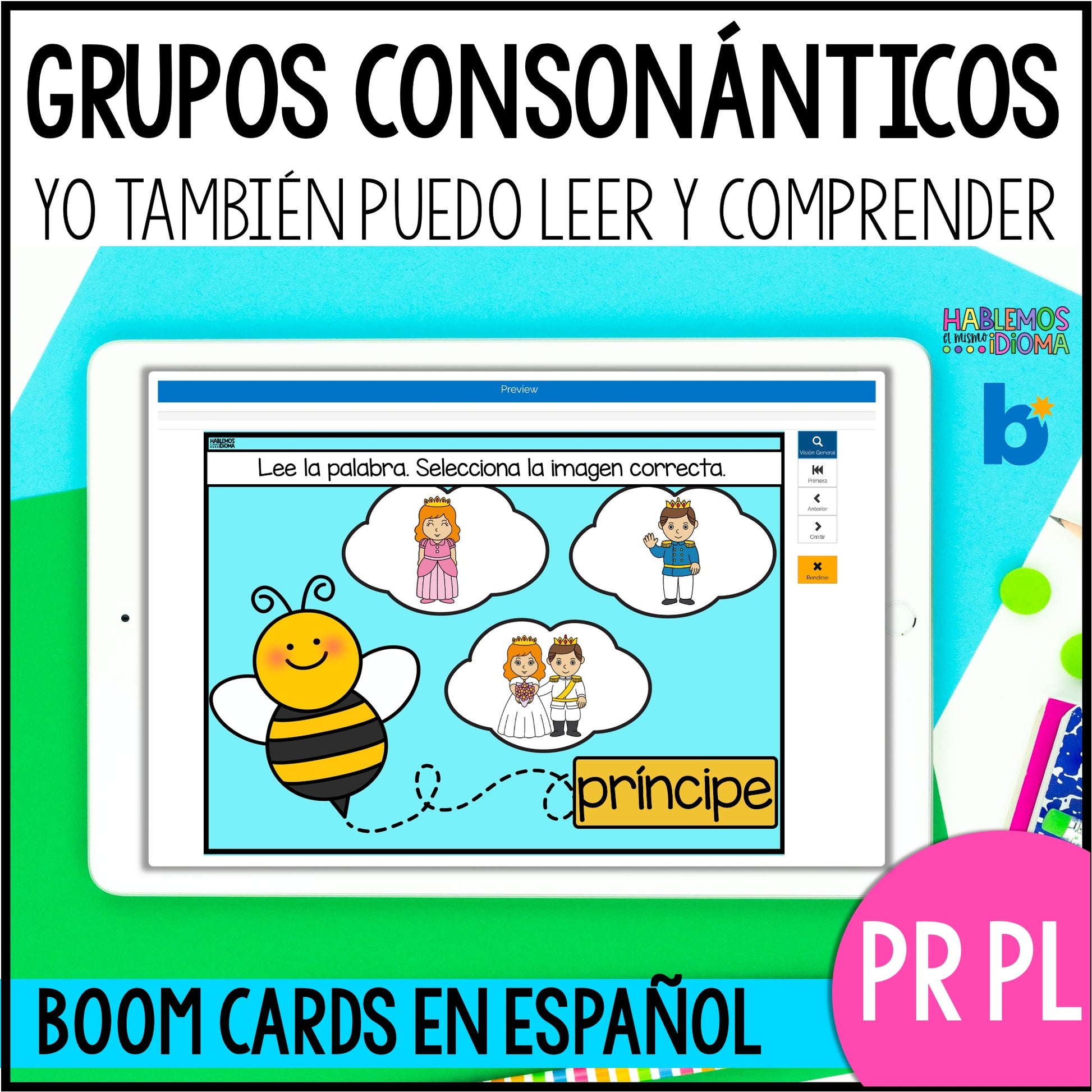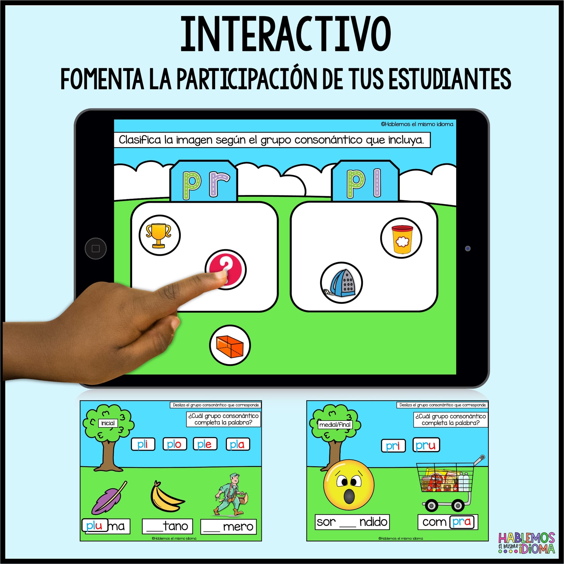 Este recurso consta de una presentación en PowerPoint y tarjetas interactivas digitales Boom Cards. Es ideal para la rutina en la clase de español, terapia educativa y terapia de habla y lenguaje. Esta va desde lo más sencillo identificación y sonido del grupo consonántico hasta la lectura palabras, oraciones y párrafo corto.