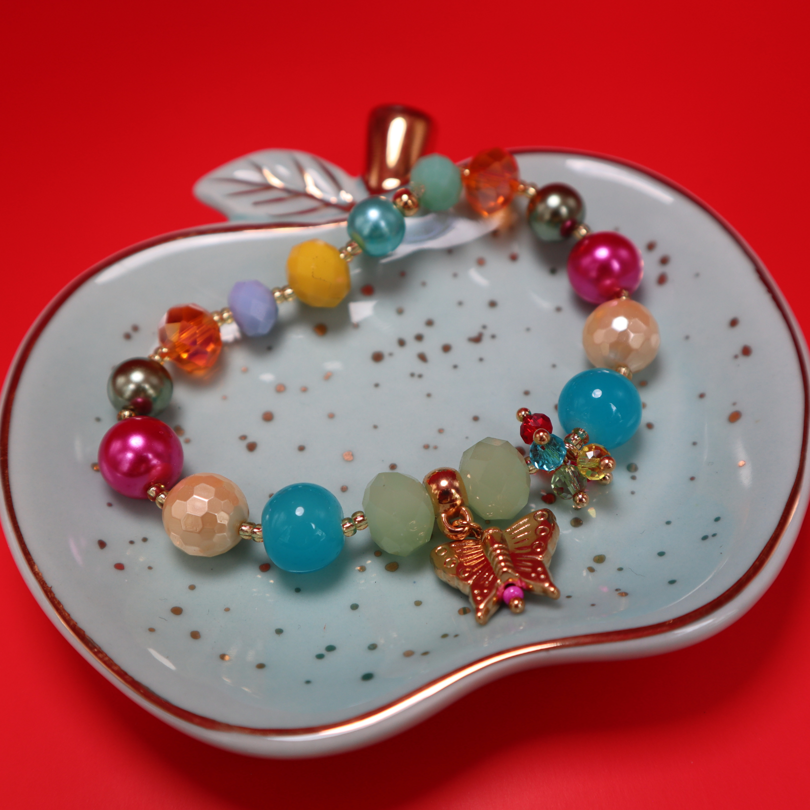 Una pieza vibrante que combina la energía del color con la elegancia del dorado. Su dije de mariposa simboliza transformación y libertad, recordándote que siempre estás en constante crecimiento.