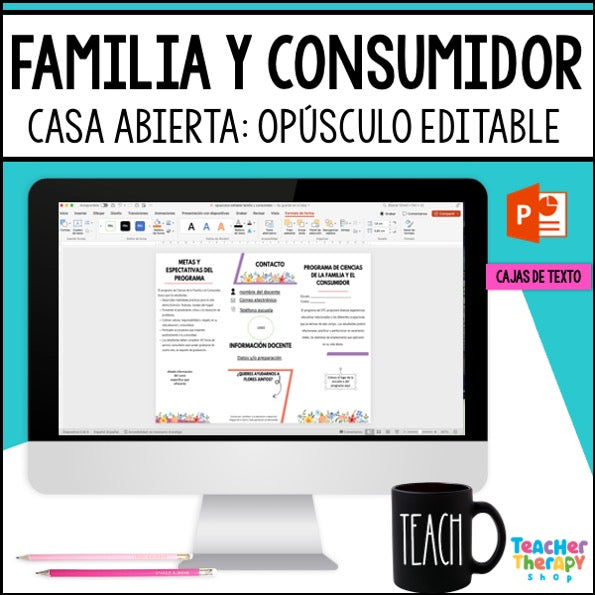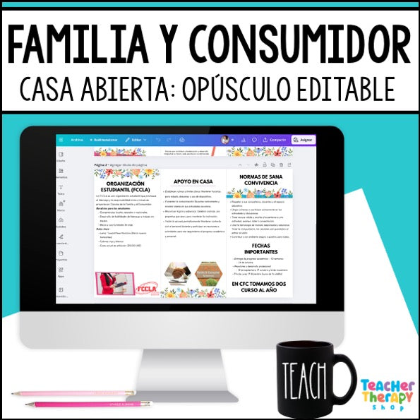 Este opúsculo editable con diseño floral está pensado para docentes de escuela secundaria que desean entregar en la reunión inicial de padres (Open House) un documento resumido, claro, visual y profesional. Específicamente para aquellos que laboran como docentes del programa de ciencias de la familia y el consumidor.