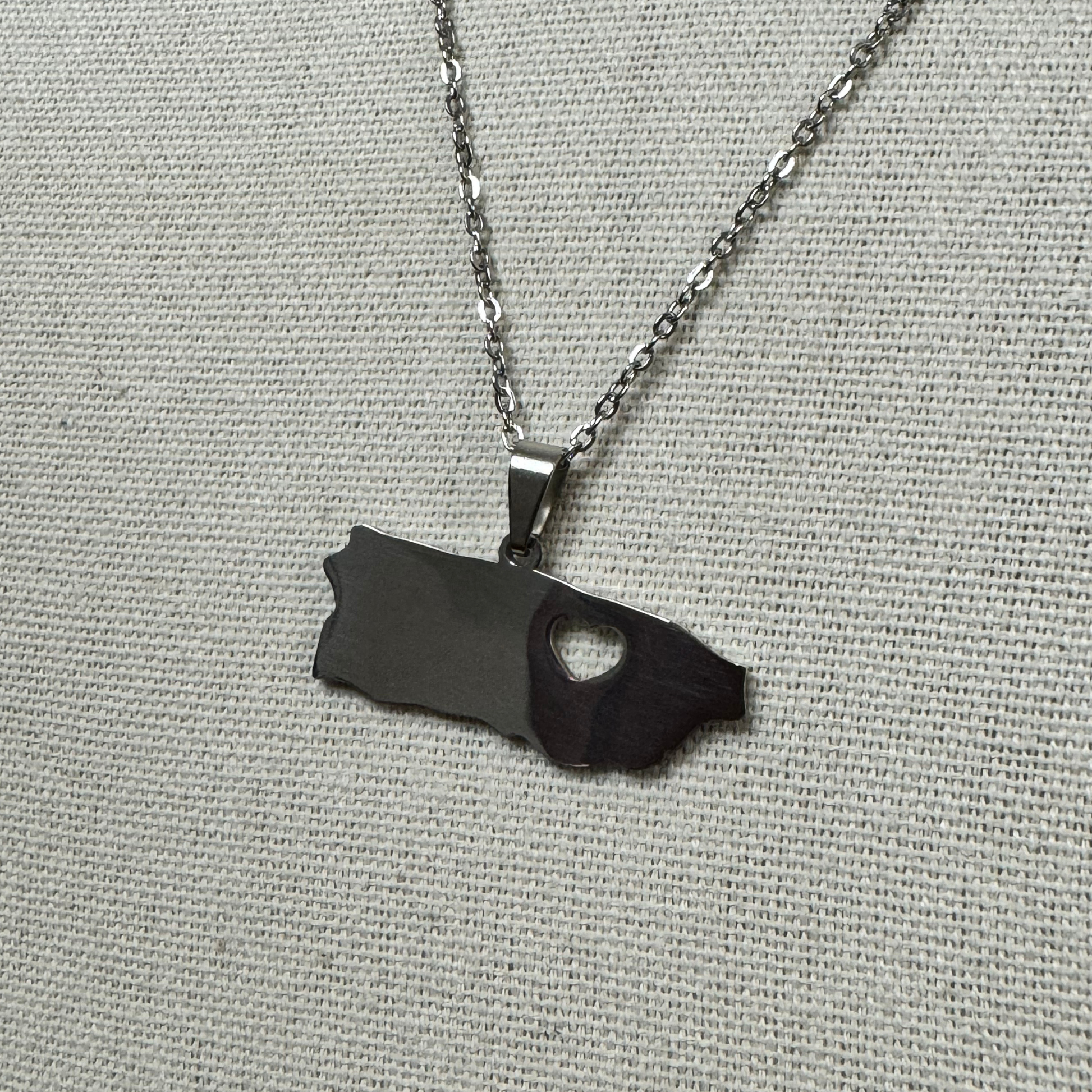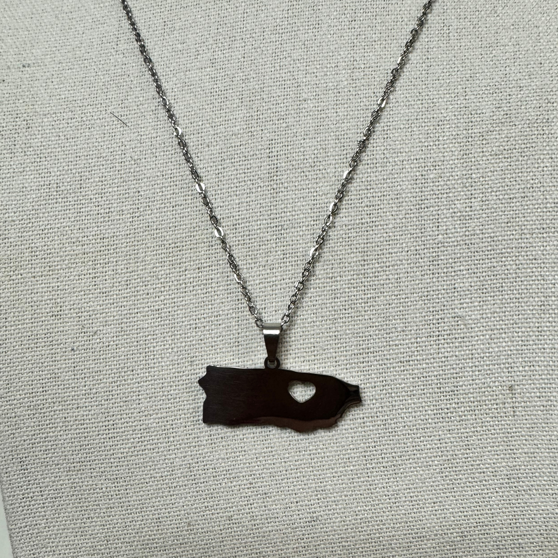 Cadena con colgante en forma de Puerto Rico, detalle de corazón en acero inoxidable.