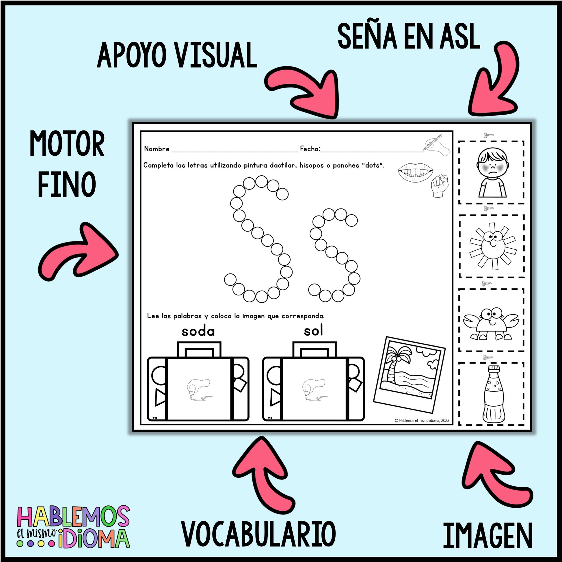 En cada plantilla encontrarás la grafía, dos palabras de vocabulario, recortables, letra en seña A.S.L y sonido utilizando pictograma de labios.
